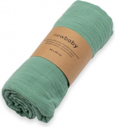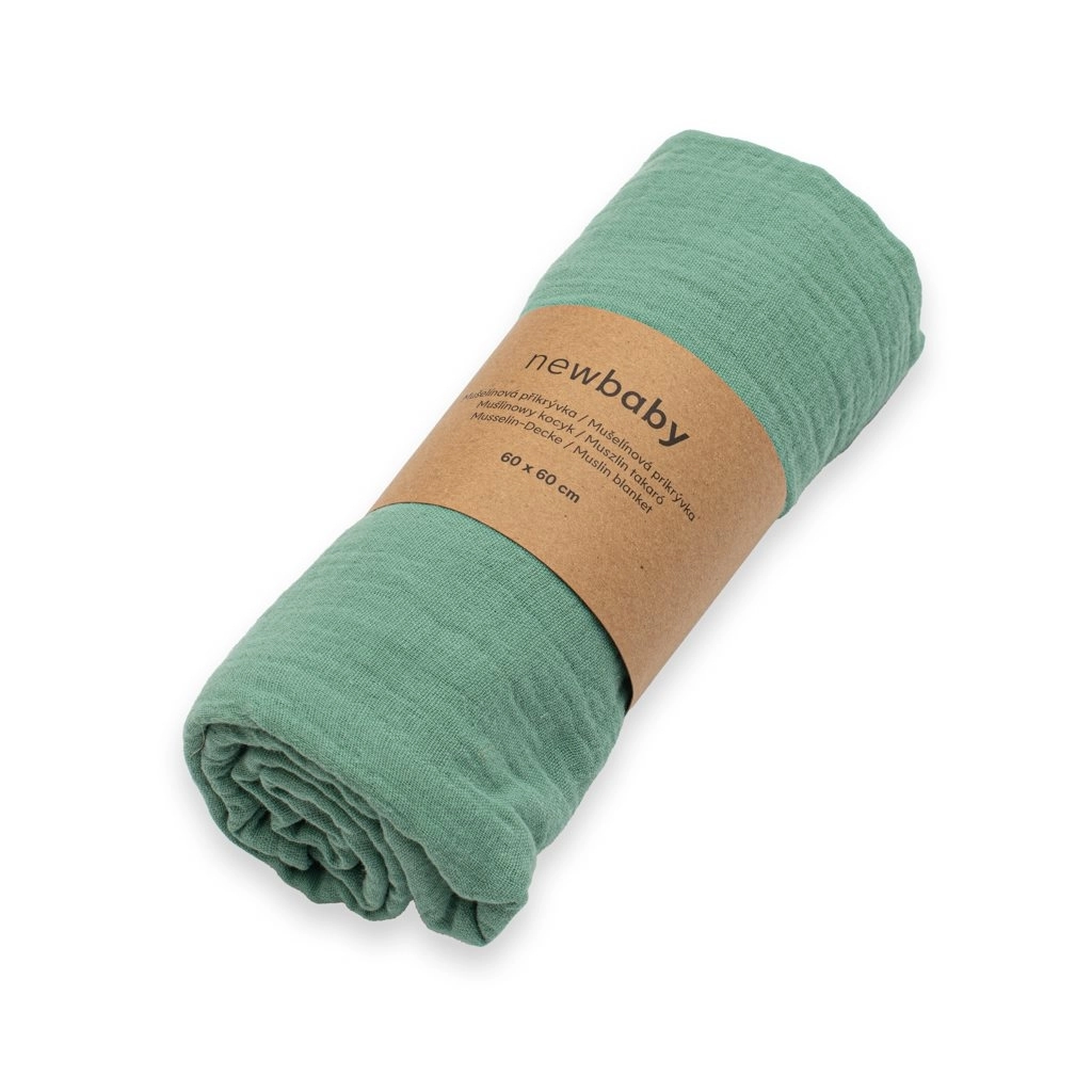 Könnyű és puha NEW BABY muszlin takaró zöld színben a baba mindennapi kényelméért. 100% organikus pamutból készült, légáteresztő, gyengéd a bőrhöz, és egész évben használható.