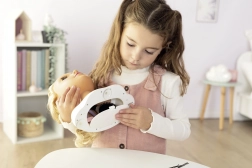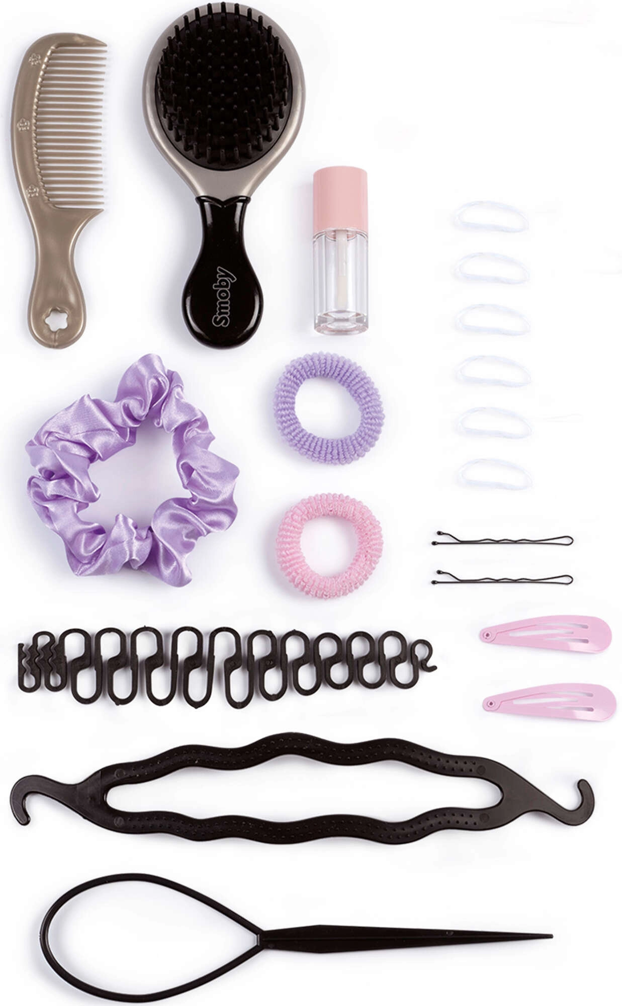 Fedezd fel a frizurák kreatív világát a SMOBY márka hosszú, szőke hajjal és kék szemmel rendelkező stylist fejével. A gazdag, 19 fodrász- és stylingkiegészítőből álló készletnek köszönhetően a gyerekek gyakorolhatják a fésülést, fonást és hajdíszítést, miközben fejlesztik fantáziájukat, finommotorikájukat és esztétikai érzéküket. A csomag része a biztonságos, gyerekeknek való „varázs” ajakfény is, amely hő hatására színt vált.
