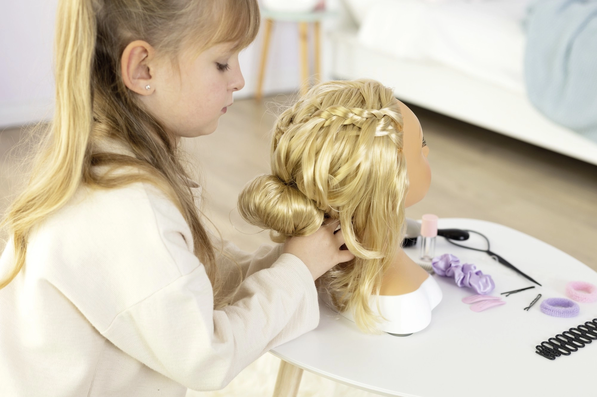 - Stylist fej, kefe, fésű, csatok, hullámcsatok, hajgumik, fonóeszközök, gyerek „varázs” ajakfény