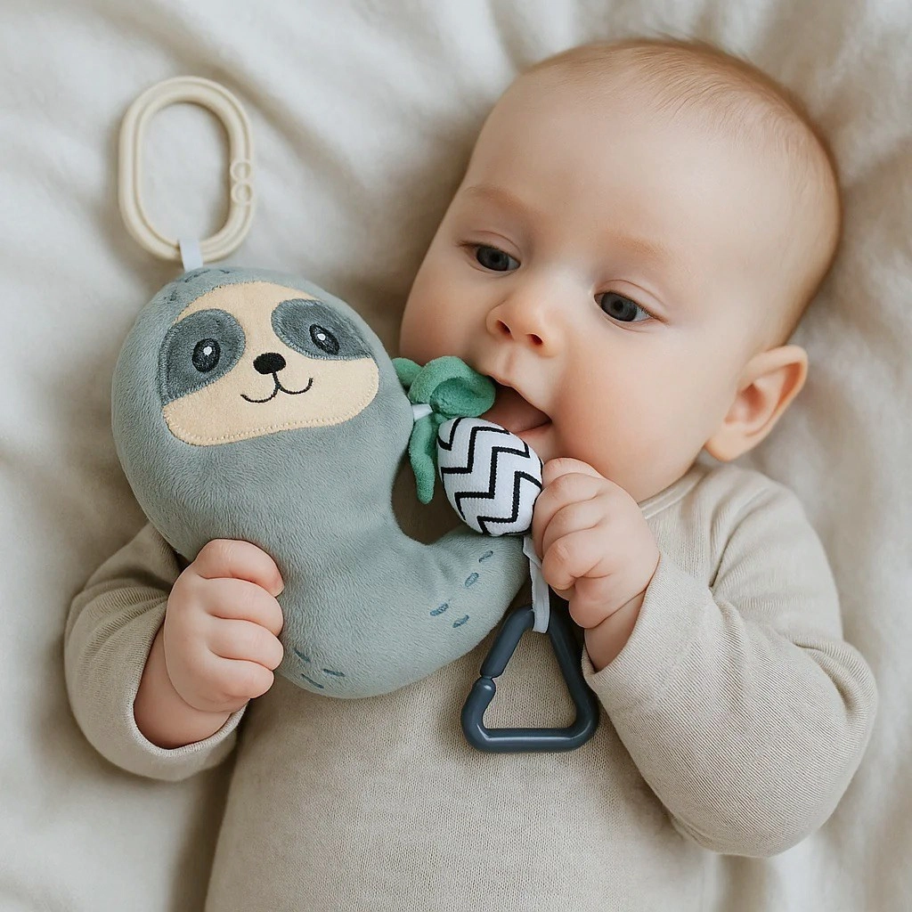 Az integrált csörgők fejlesztik a hallási észlelést és ösztönzik az interakciót. A játék minőségi és biztonságos anyagokból készül, kisbabák számára alkalmas, és könnyen tisztítható. Tökéletes babakocsira, autósülésre vagy kiságyba kiegészítőként.