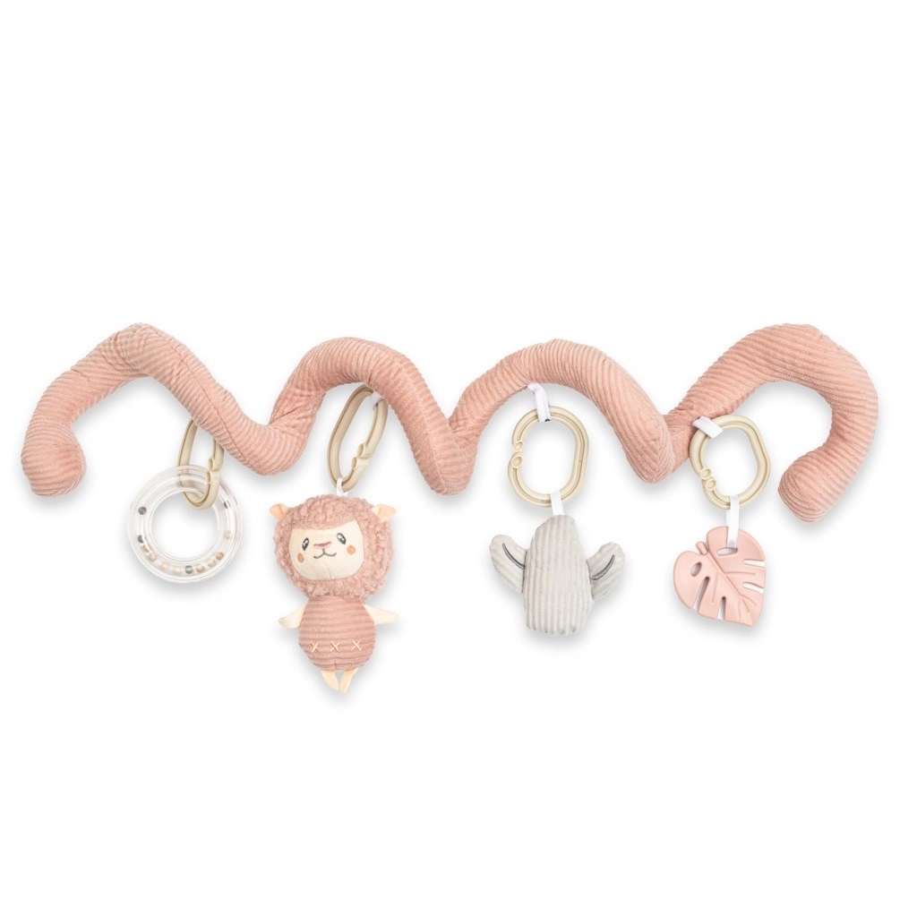 A NEW BABY márka aranyos, lámás motívummal készült spirális játéka otthon és útközben is interaktív szórakozást biztosít a babának. Okos spirális formájának köszönhetően könnyen rögzíthető a kiságyra, a babakocsira vagy az autósülésre. Csipogót, csörgőt és rágókát tartalmaz az érzékelés stimulálására és a fogzás alatti megnyugtatásra. Minőségi és biztonságos anyagokból készült.