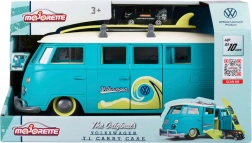 A MAJORETTE nagy, interaktív Volkswagen T1 modellje lenyűgöz a precíz kivitelével és a legendás kempingbusz hiteles részleteivel. A kékeszöld, krémszínű elemekkel díszített furgon formájú hordozó praktikus játékkofferé nyílik, parkolóhelyekkel a mellékelt kisautó számára. Az elöl lévő, VW embléma alakú gomb fényes lámpákat aktivál.
