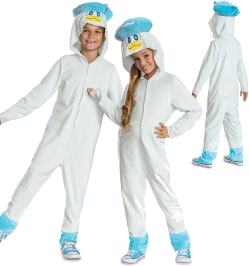 Puha gyerek kigurumi jelmez, amelyet a POKEMON Quaxly ihletett, és kényelmet, meleg anyagot valamint könnyű cipzáras felvételt kínál. Ideális farsangra, otthoni játékra és pihenésre – a gyerek felveszi a kacsaarcot ábrázoló kapucnit, és máris kedvenc vízi Pokémonná változik.
