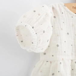 Pehelykönnyű muszlin New Baby Zora ruha rövid ujjal, tökéletes a nyári napokra. Az A-vonalú fazon és a finoman ráncolt szoknya egyszerre kényelmes és stílusos. Az elöl található gombos zárás megkönnyíti az öltöztetést, a 100% pamut muszlin pedig légáteresztő, puha és kíméletes az érzékeny bababőrhöz.