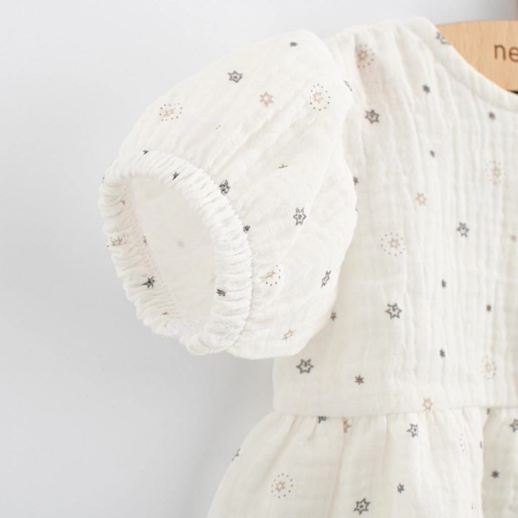 Pehelykönnyű New Baby Zora muszlin ruha kis divatkedvelőknek. A-vonalú szabású, rövid ujjú, kényelmes elülső gombolással és ráncolt szoknyával. Finom, jól szellőző, 100% pamut muszlinból – puha tapintású, levegős és egész nap kényelmes viselet.
