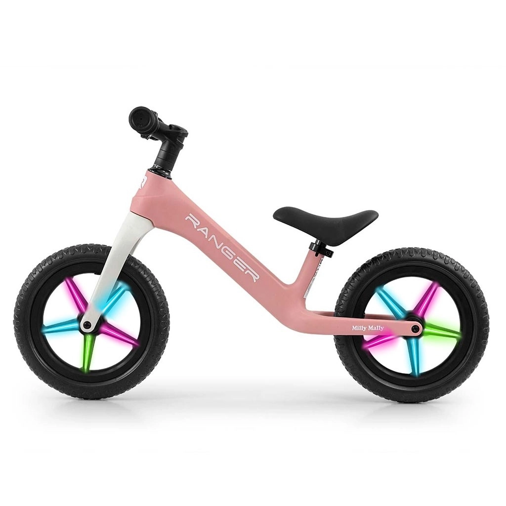 A könnyű MILLY MALLY Ranger Flash rózsaszín futóbicikli segít a gyerekeknek fejleszteni az egyensúlyt és a koordinációt, mielőtt áttérnének a pedálos kerékpárra. Kompozit vázat, karbantartást nem igénylő 12″-es EVA kerekeket és állítható ülésmagasságot kínál a kényelemért és a gyermek növekedéséhez igazodva. A csapágyazott kormány és kerekek, a puha, csúszásmentes markolatok és a felnisugarakat megvilágító LED-ek növelik a biztonságot és a vezetés élményét.