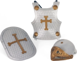 A készlet tartalmaz mindent, amire a kis lovagoknak szükségük van hősies álmaik megvalósításához – kardot hüvellyel, pajzsot, sisakot és mellényt.