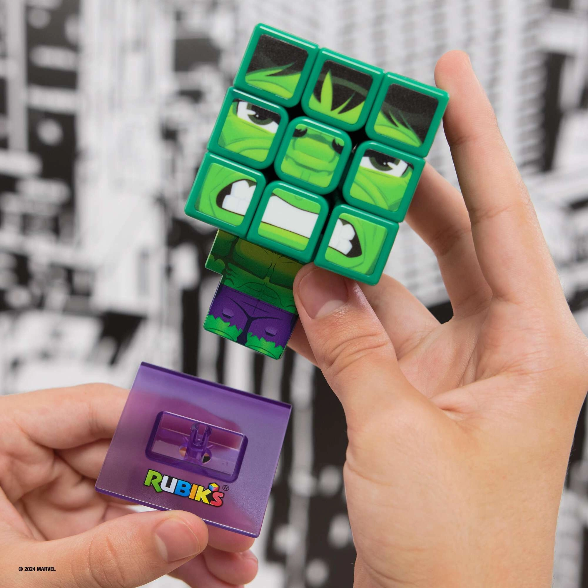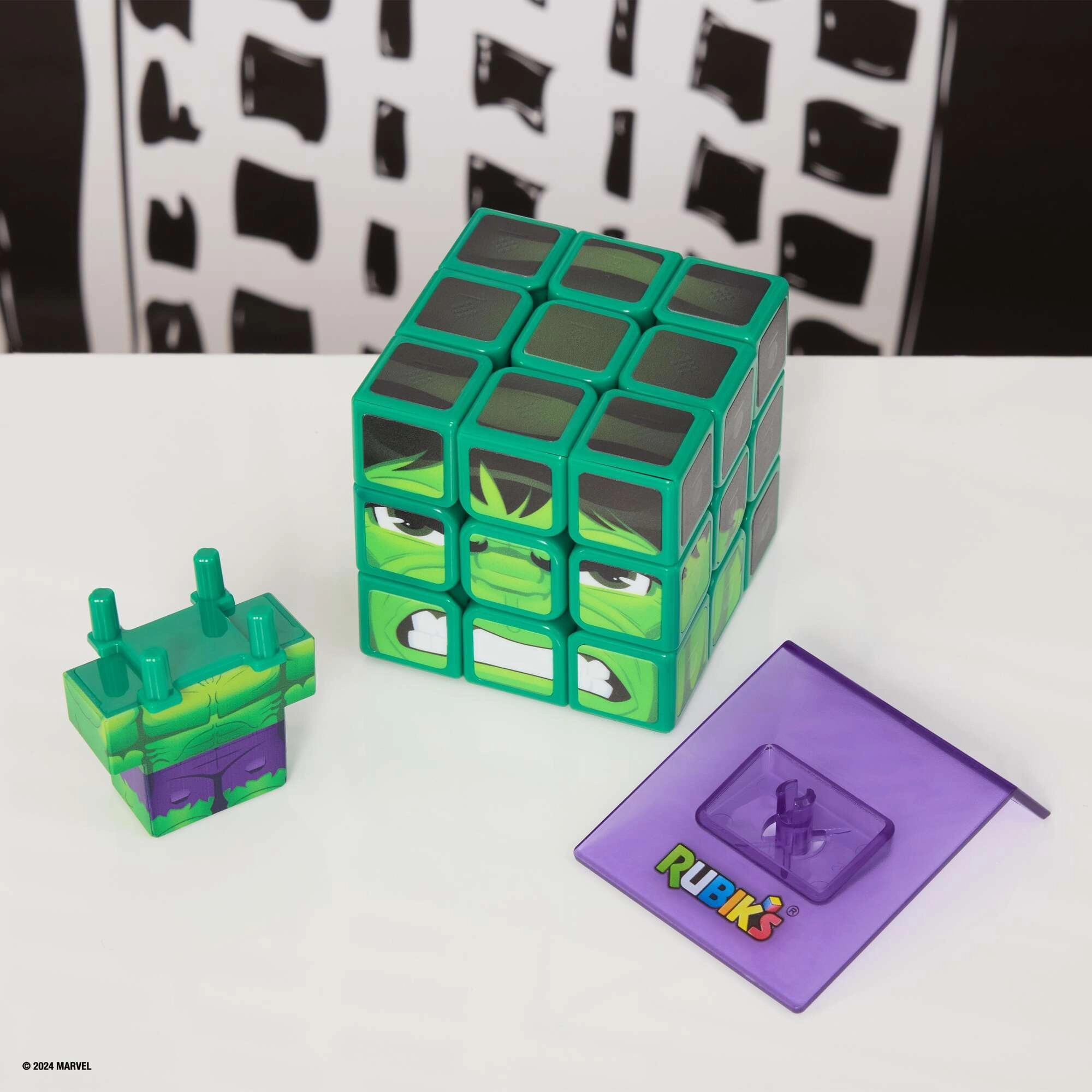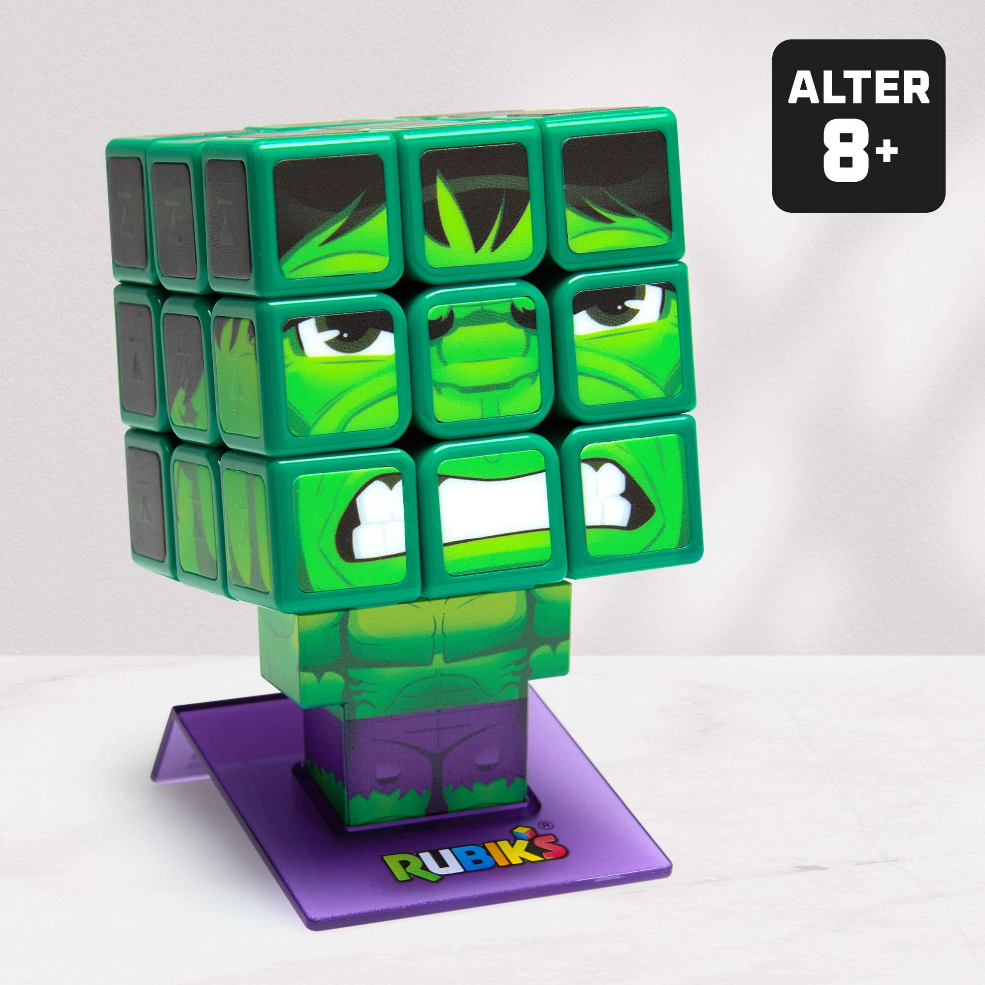 Fedezd fel az ikonikus logikai játék hősi köntösben: a Rubik 3x3 HULK Cubers a klasszikus kirakót ötvözi a látványos MARVEL motívummal. Forgasd, keverd és illeszd össze az elemeket, hogy kirakd a jellegzetes HULK arcot – majd helyezd a kockát a lila állványra, és egészítsd ki a törzzsel, így stílusos kiállítható figurát kapsz.