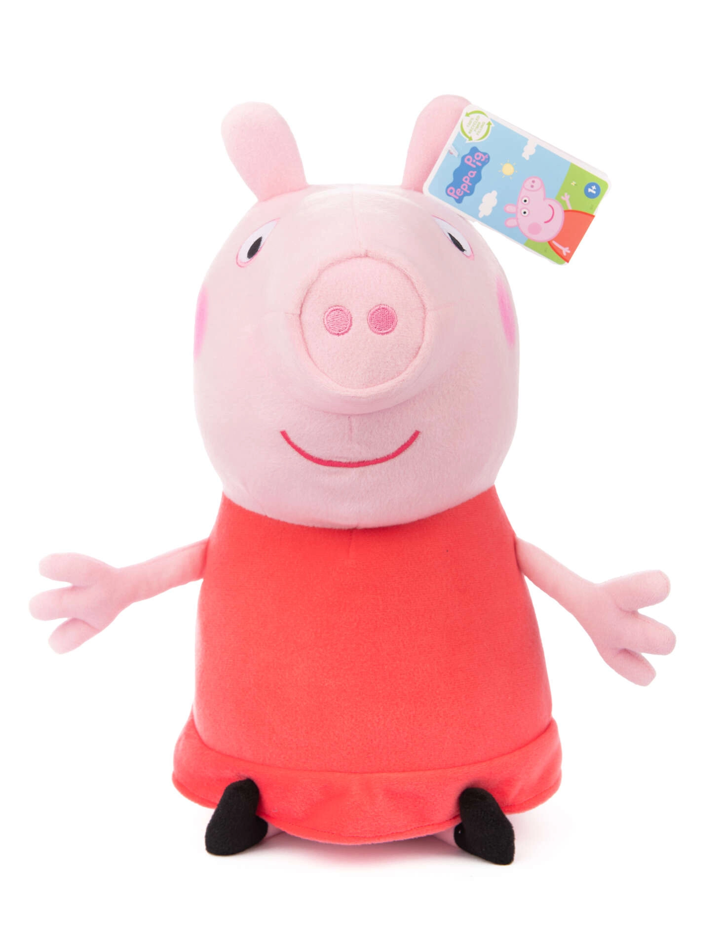 A hű részletek, mint a hímzett szemek és mosoly, a jellegzetes piros ruha és a fekete cipőcskék a Peppa Pig sorozatból ismert eredeti megjelenést hangsúlyozzák. Az apró részek nélküli, biztonságos kivitel már 1 éves kortól megfelelő.