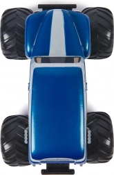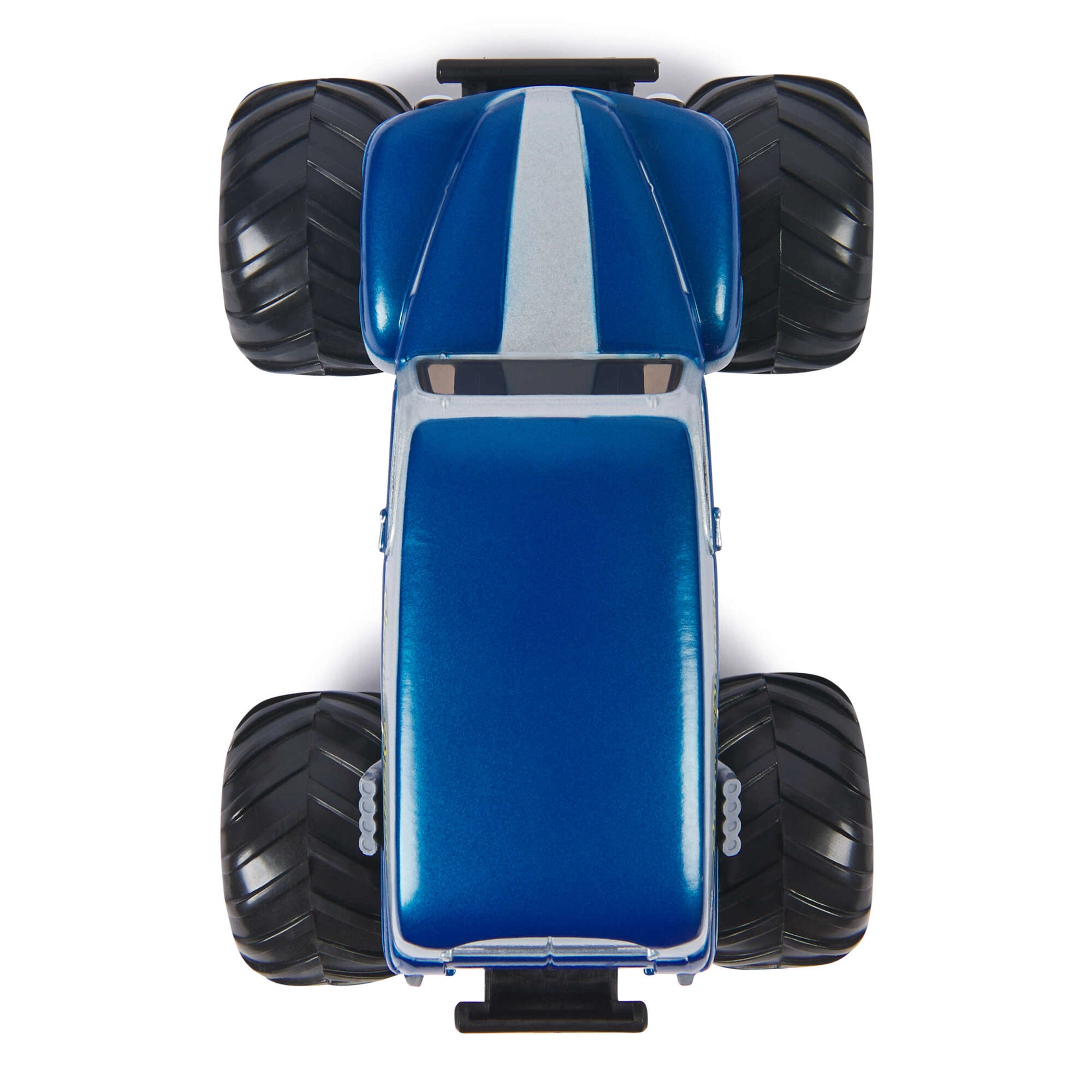 Részletgazdag kék‑ezüst karosszéria, megemelt futómű és ikonikus megjelenés a Monster Jam élmény hű visszaadásáért.