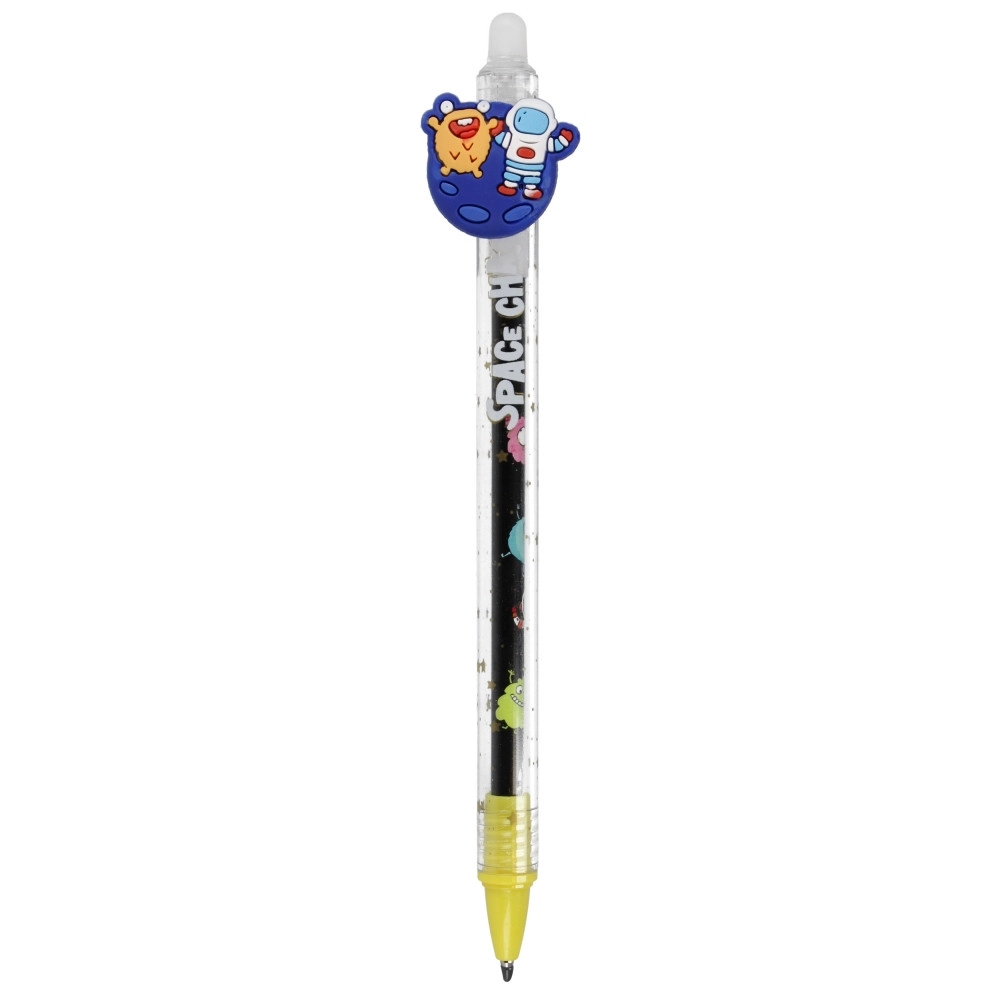 Az átlátszó testet bolygók, rakéták és csillámok díszítik, amelyeket egy vidám topper egészít ki – a toll stílusos kiegészítővé válik a tolltartóban.