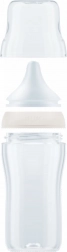 A praktikus NUK hőmérséklet‑jelző a beosztások között hőmérőként működik – túl forró tartalomnál kifehéredik, ideális hőmérsékleten (kb. 37 °C) kék marad. Az üveg tartós, törésálló, BPA‑mentes polipropilénből készült, kellemes tapintású, biztonságos fogást nyújt, és stabil, széles alappal rendelkezik.