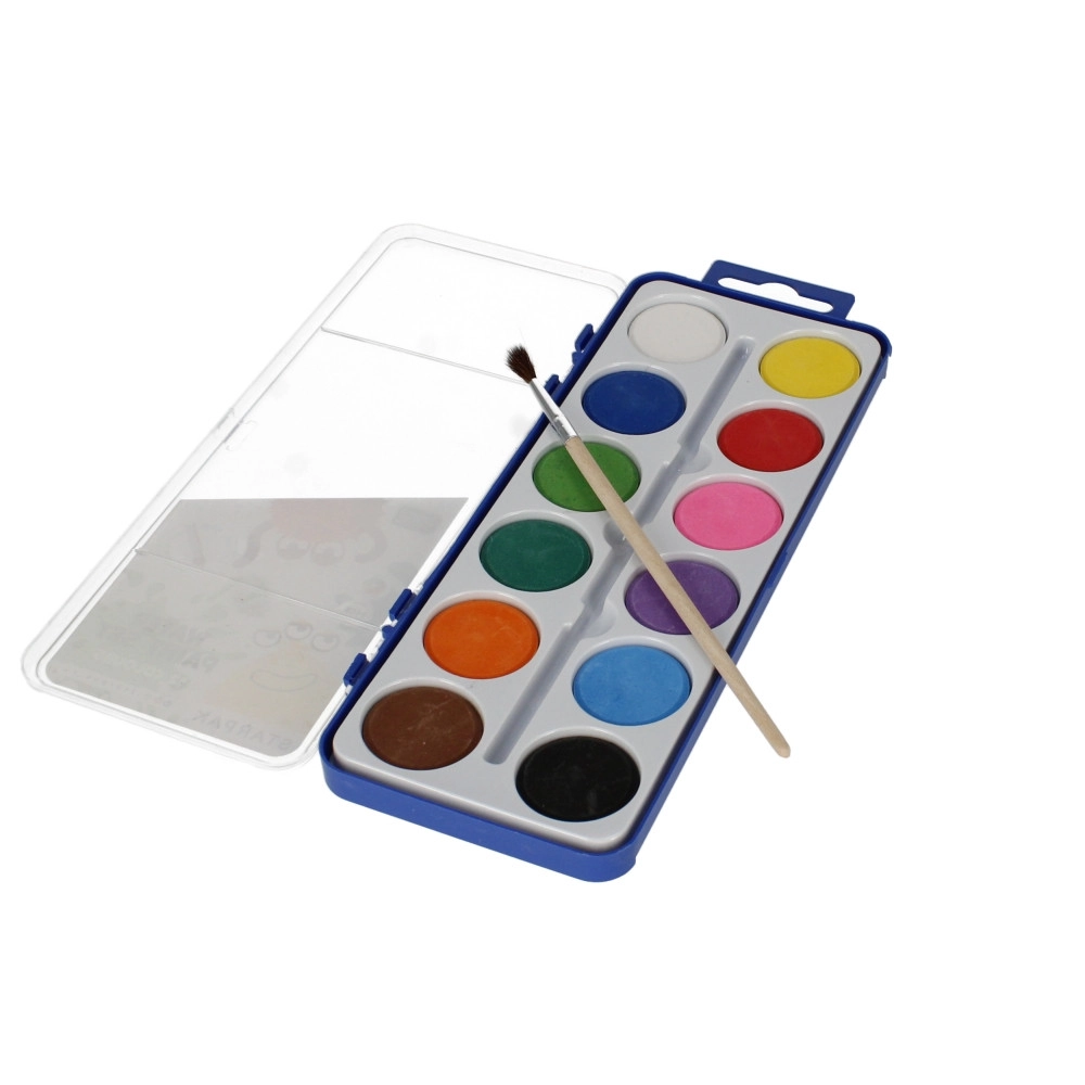 Praktikus vízfesték-készlet ecsettel kisebb és nagyobb alkotóknak. Tartalmaz 12 élénk színt kompakt tokban, mérete 8 × 22 × 1 cm. Ideális 3 éves kortól, otthoni kreatív alkotáshoz és iskolai rajzórákra.
