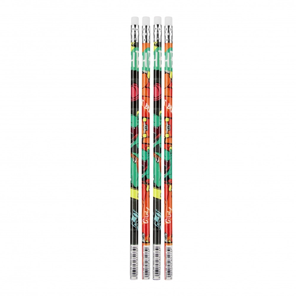 Minőségi Dino mintás ceruzakészlet beépített radírral, ideális iskolásoknak és otthoni kreatív íráshoz. Univerzális HB keménységet, kényelmes 19 cm hosszúságot és praktikus, 4 darabos csomagolást kínál. 3 éves kortól ajánlott.