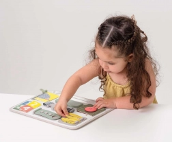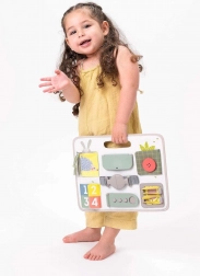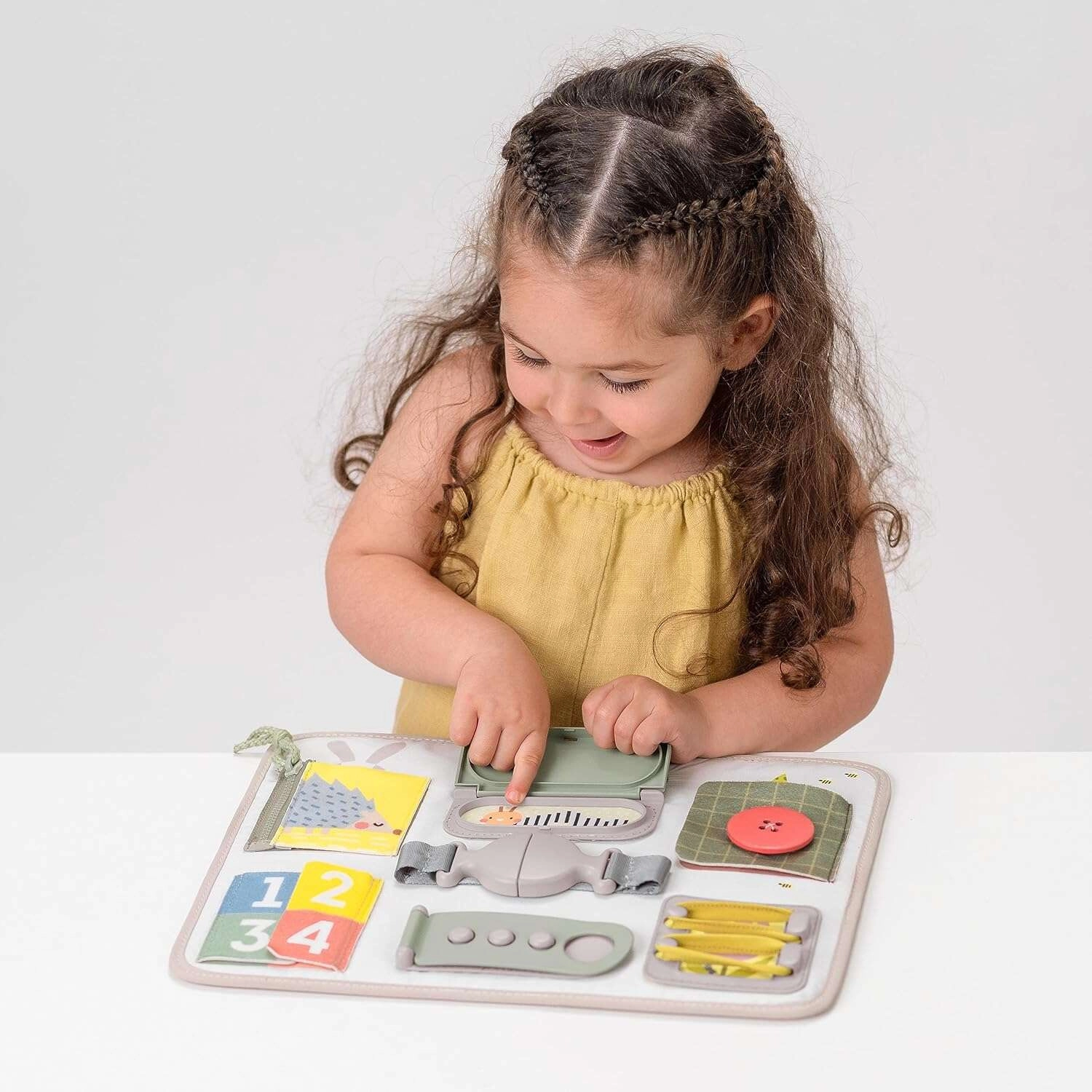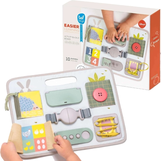 Fedezze fel az okos és biztonságos eszközt a mindennapi játékos tanuláshoz. A TAF TOYS Activity Buckle Board 18 hónapos kortól ajánlott, és ötvözi a gyakorlati rögzítő elemeket (cipzár, gomb, csat, tépőzárak) a szenzoros elemekkel és a számlálást segítő aktivitásokkal. A beépített fogantyú megkönnyíti a hordozást, így a táblát könnyedén magával viheti kirándulásra, autóba vagy a nagyszülőkhöz.