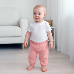 Fedezze fel a kényelmet és a praktikusságot egyben. Ez a gyermekszett a gombolás nélküli, puha pamut pólót finom nyakszegéllyel modern, egyszínű, bő szabású muszlin nadrággal ötvözi. A könnyű, levegős anyagnak köszönhetően ideális egész napos viseletre otthon, kint és az óvodában is.