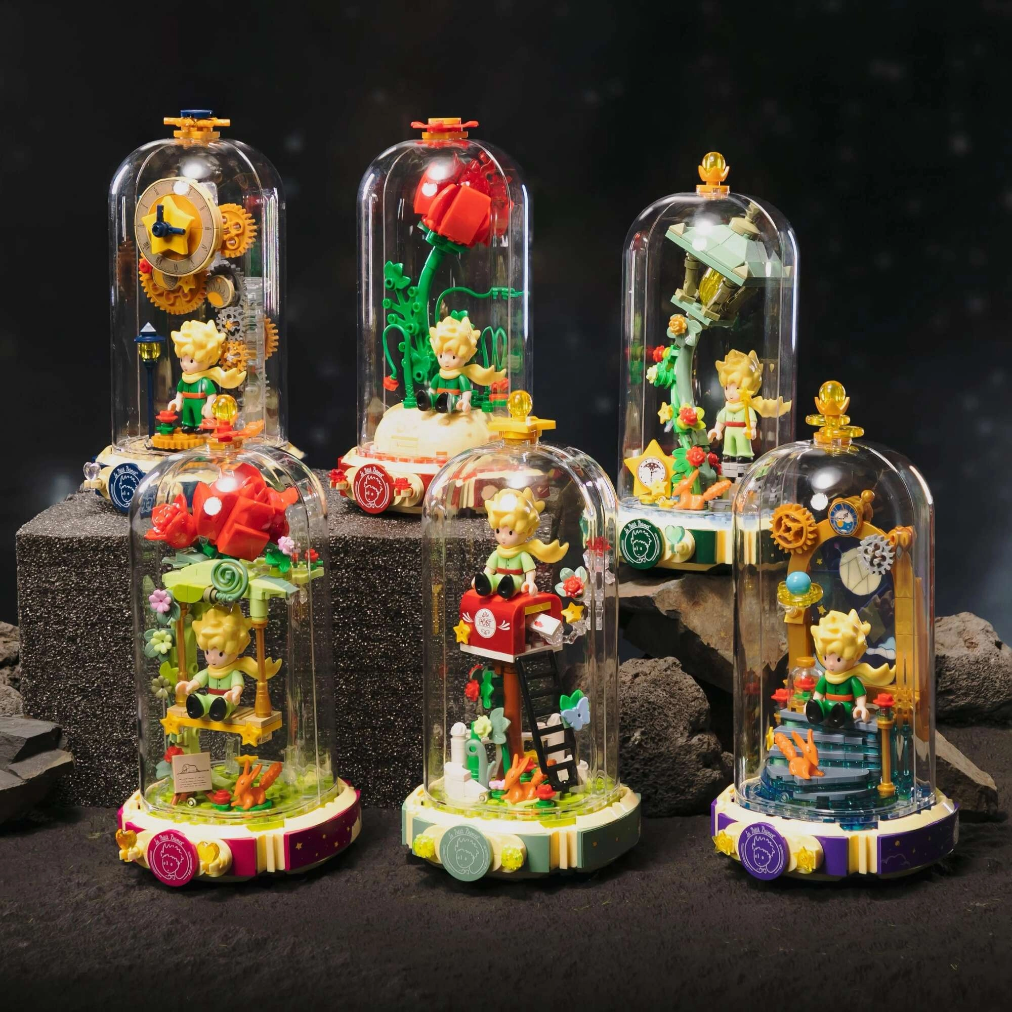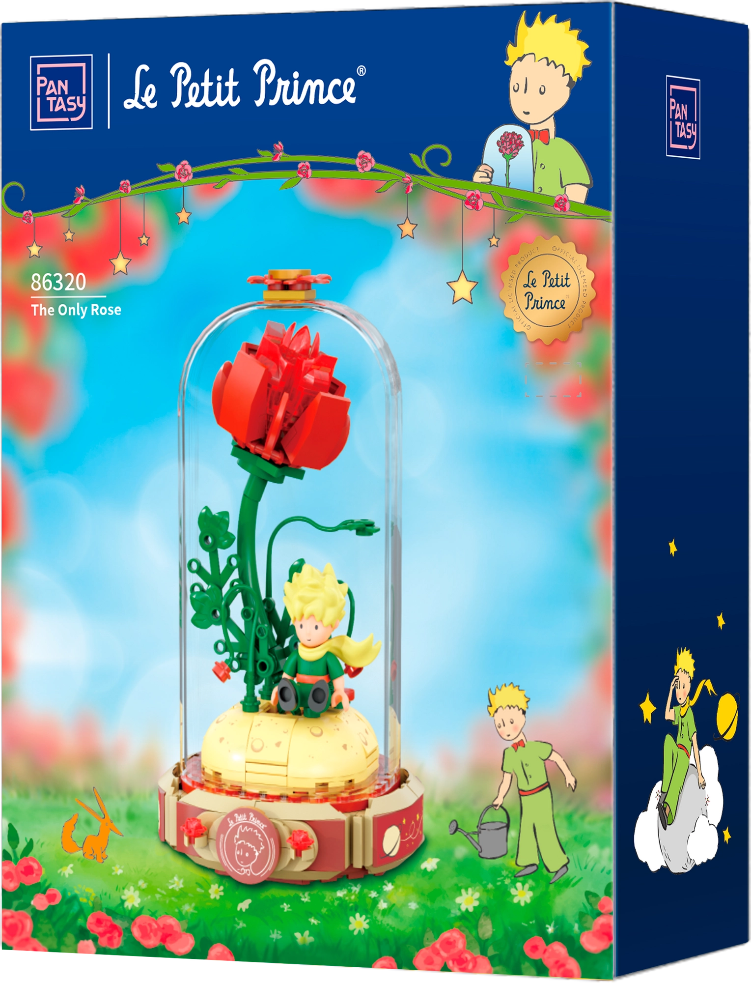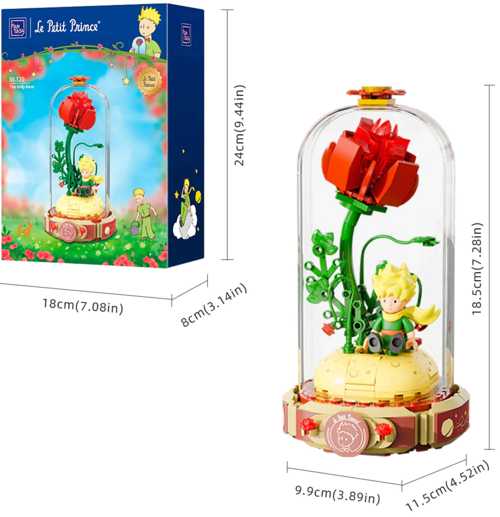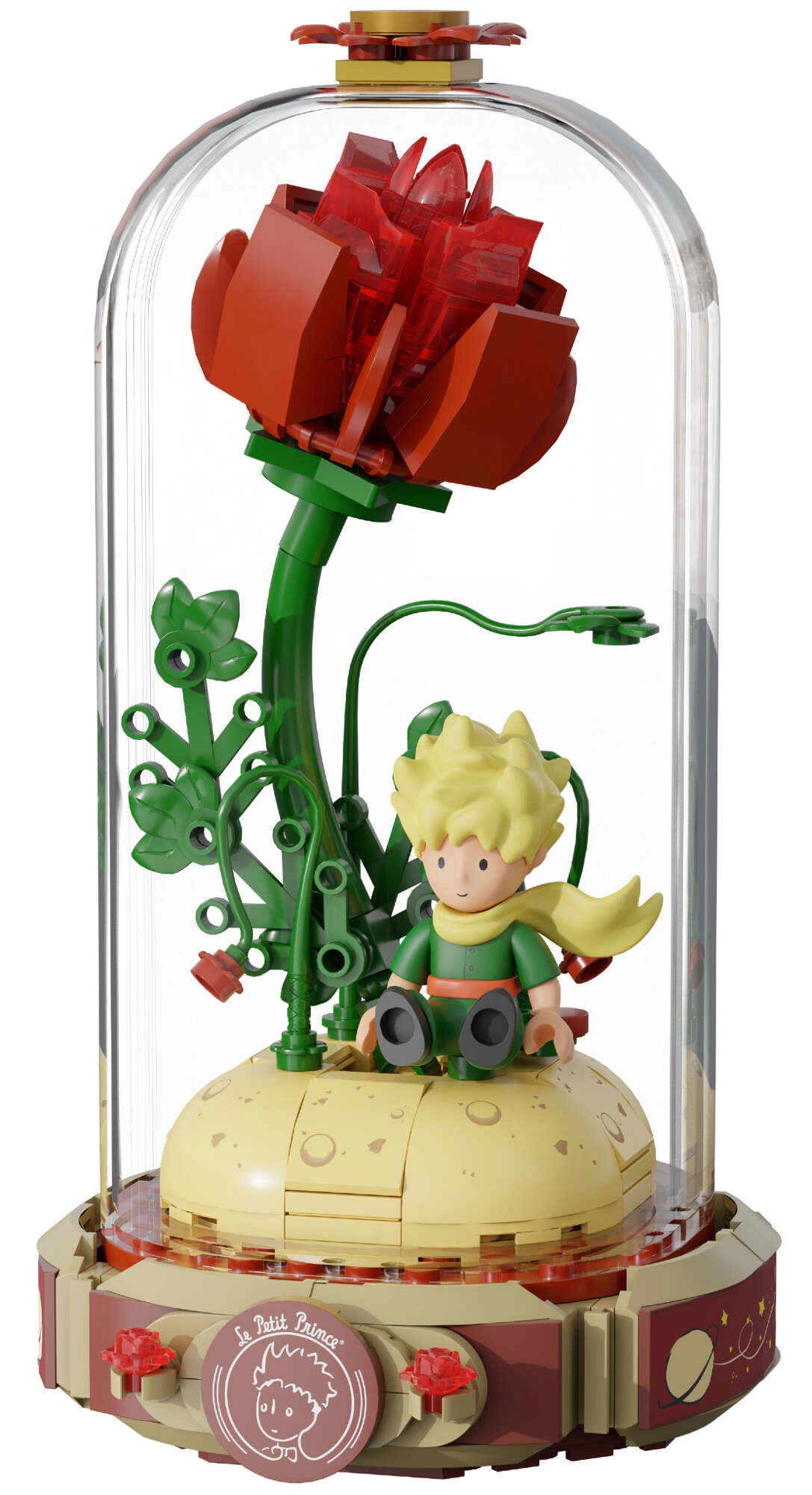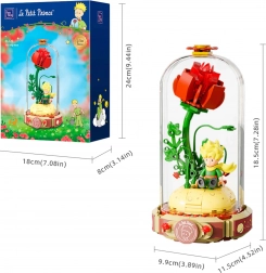 Építse meg a szimbolikus vörös rózsát egy nyitott könyv alakú talapzaton „Le Petit Prince” felirattal. Mellette A kis herceg és a róka áll jellegzetes pózban. A szárak, levelek és virágszirmok kidolgozott részletei harmóniát és eleganciát kölcsönöznek a modellnek – remek darab kiállításhoz és kreatív szórakozáshoz.