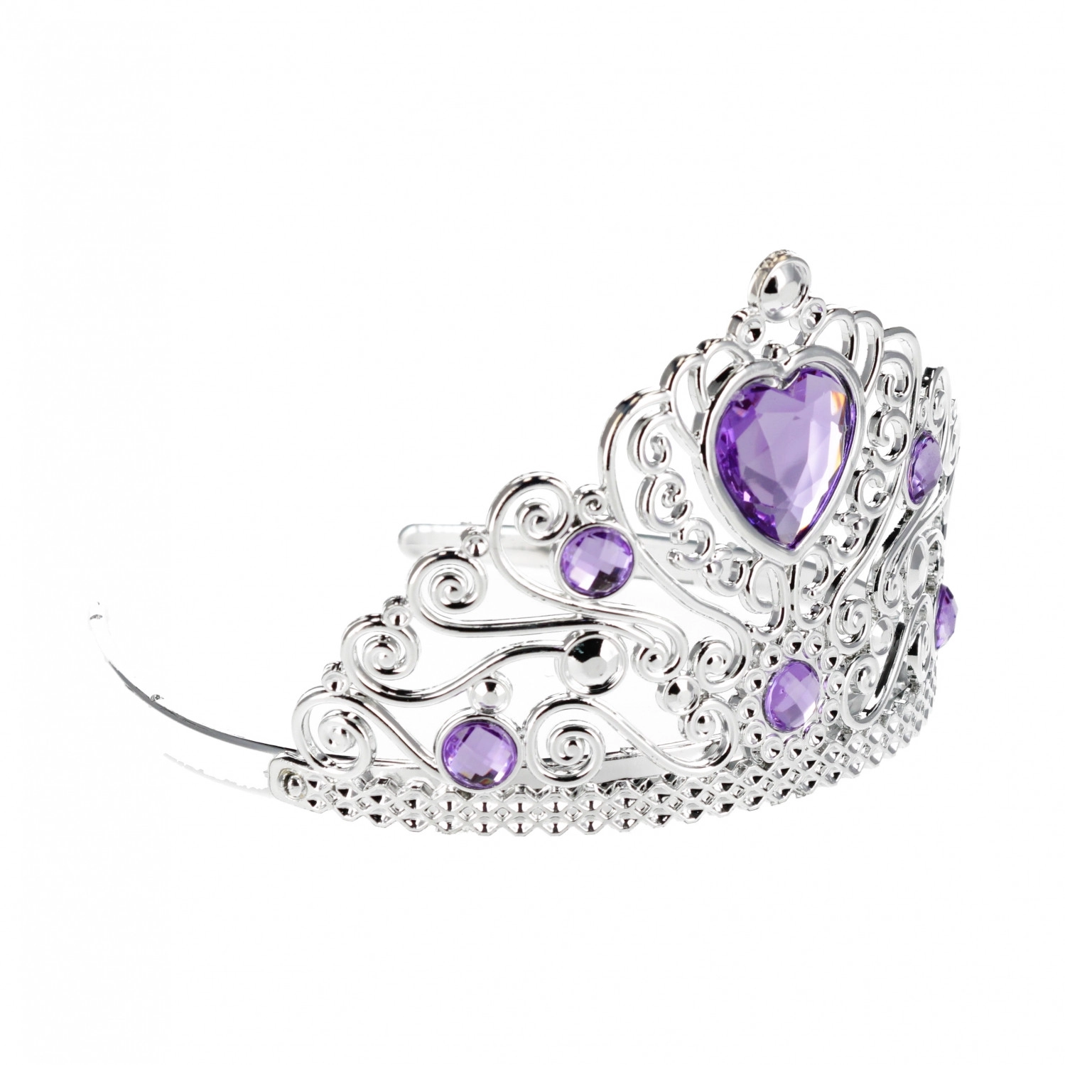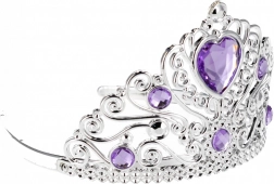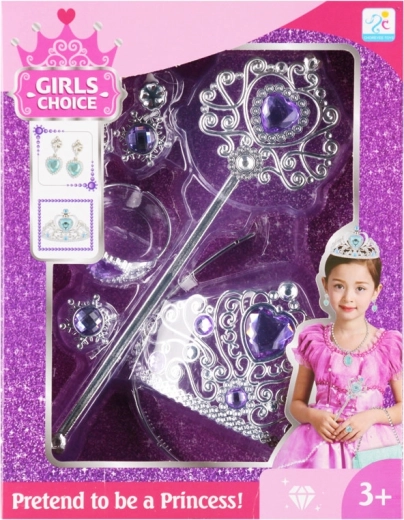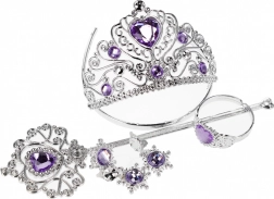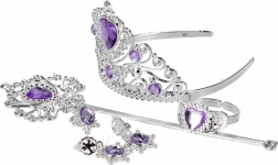 Ez az elegáns kiegészítőszett pillanatok alatt kis hercegnnyé varázsol bármely gyermeket. Az ezüstszínű, lila kövekkel díszített diadém, a hozzá illő csatok és a díszes rózsa elbűvölő megjelenést adnak, míg a gyűrű és a karkötő teljessé teszik az összeállítást. A könnyű műanyag kivitel kényelmes viseletet és biztonságos játékélményt nyújt.