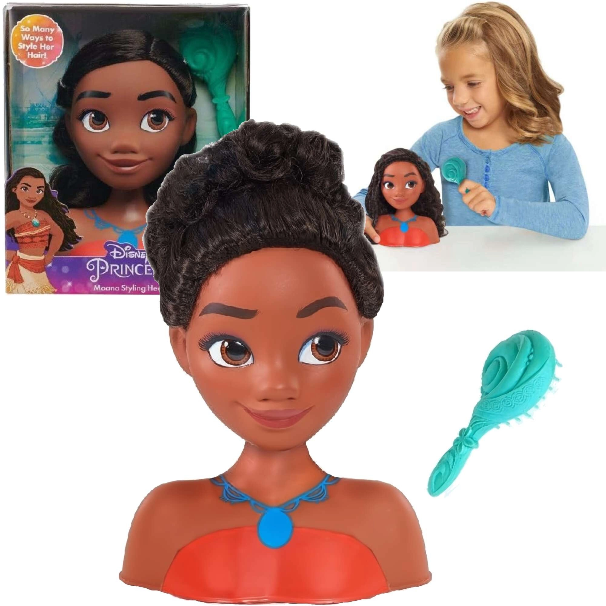 Fedezd fel a frizurák kreatív világát a VAIANA fésülhető fejjel. A hosszú, sötét haj sima és könnyen formázható, így a gyerekek gyakorolhatnak kontyokat, fonatokat és laza hullámokat is. A stabil talp kényelmes használatot nyújt asztalon vagy munkafelületen.