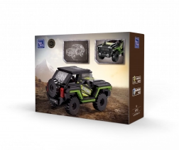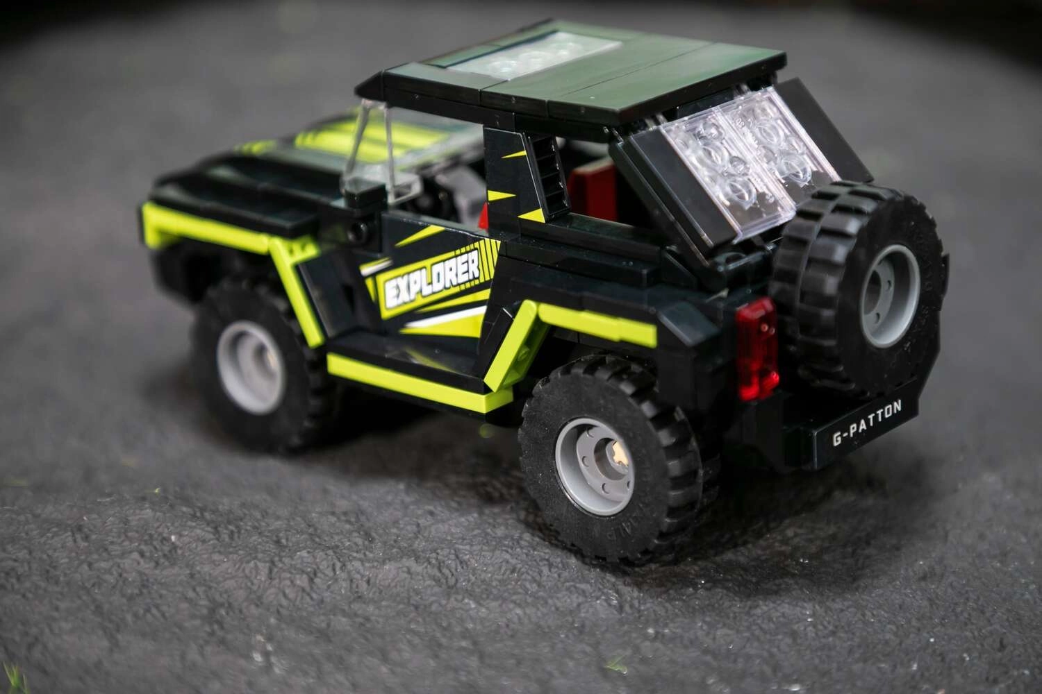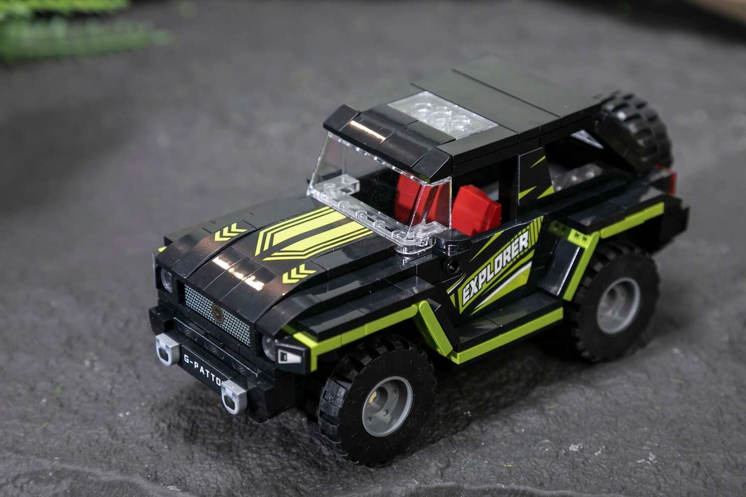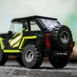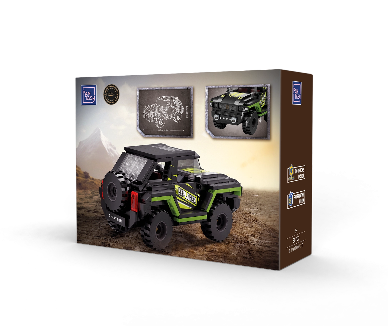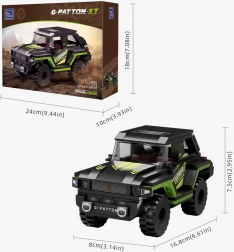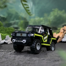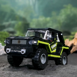 Ez a stílusos off-road modell fekete–lime kombinációban örömet szerez a valósághű részletekkel: masszív gumik, átlátszó „ablakok”, hátsó pótkerék és EXPLORER/G‑PATTON feliratok. A pontosan illeszkedő ABS elemeknek köszönhetően az építés kellemes, az eredmény pedig stabil és tartós.
