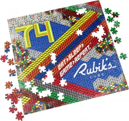 Élvezd a kikapcsolódást és a kihívást a RUBIK’S kocka 50. évfordulójára készült hivatalos kirakóval. A kész kép egy színes mozaikot ábrázol egymásra rendezett kockák falával, a feltűnő „74” számmal és a „Eat, Sleep, Game, Repeat!” szlogennel. A kontrasztos színeknek és a markáns grafikának köszönhetően a kész alkotás nagyszerűen mutat a falon, keretben.