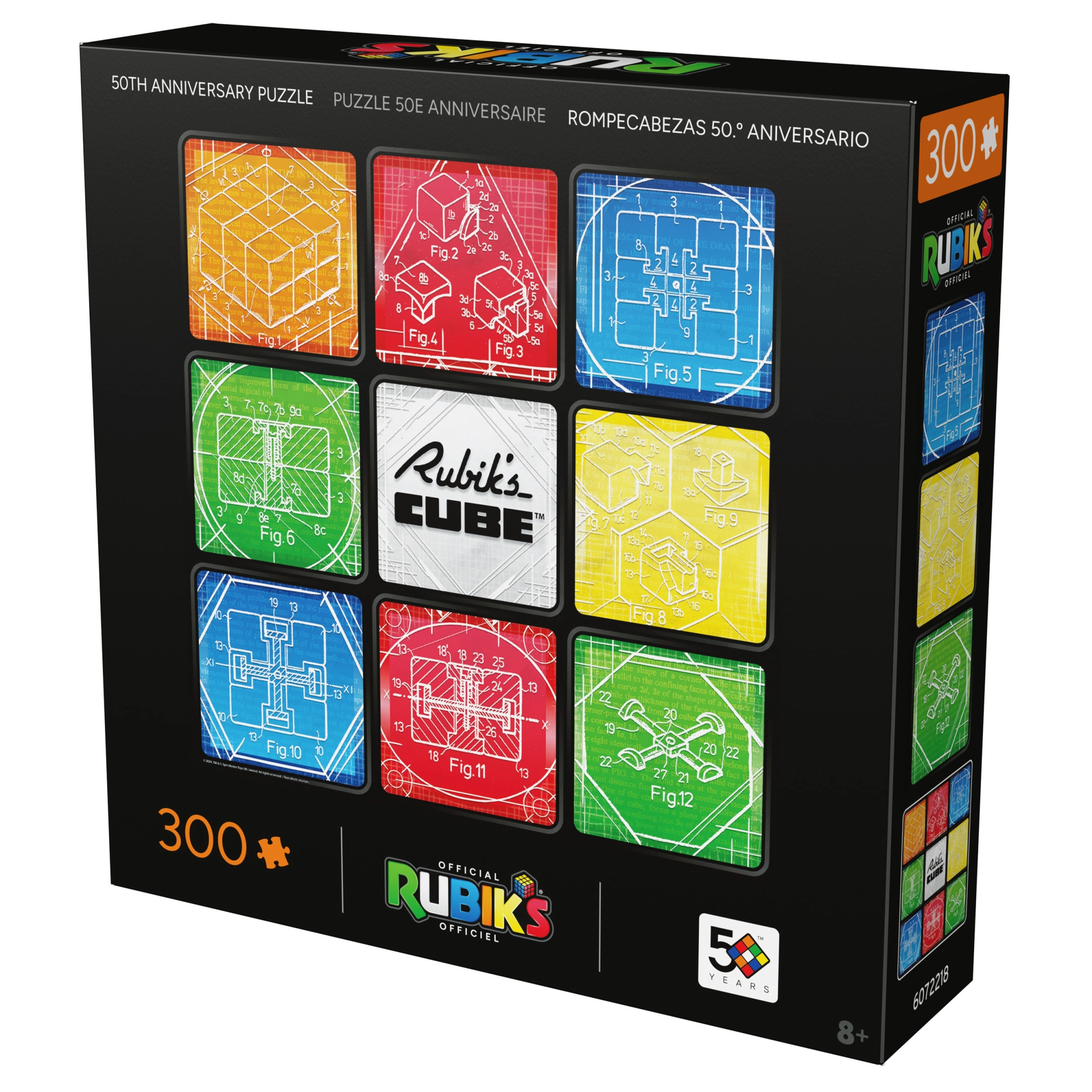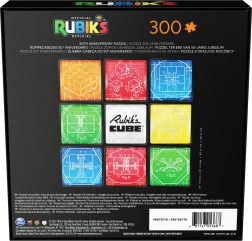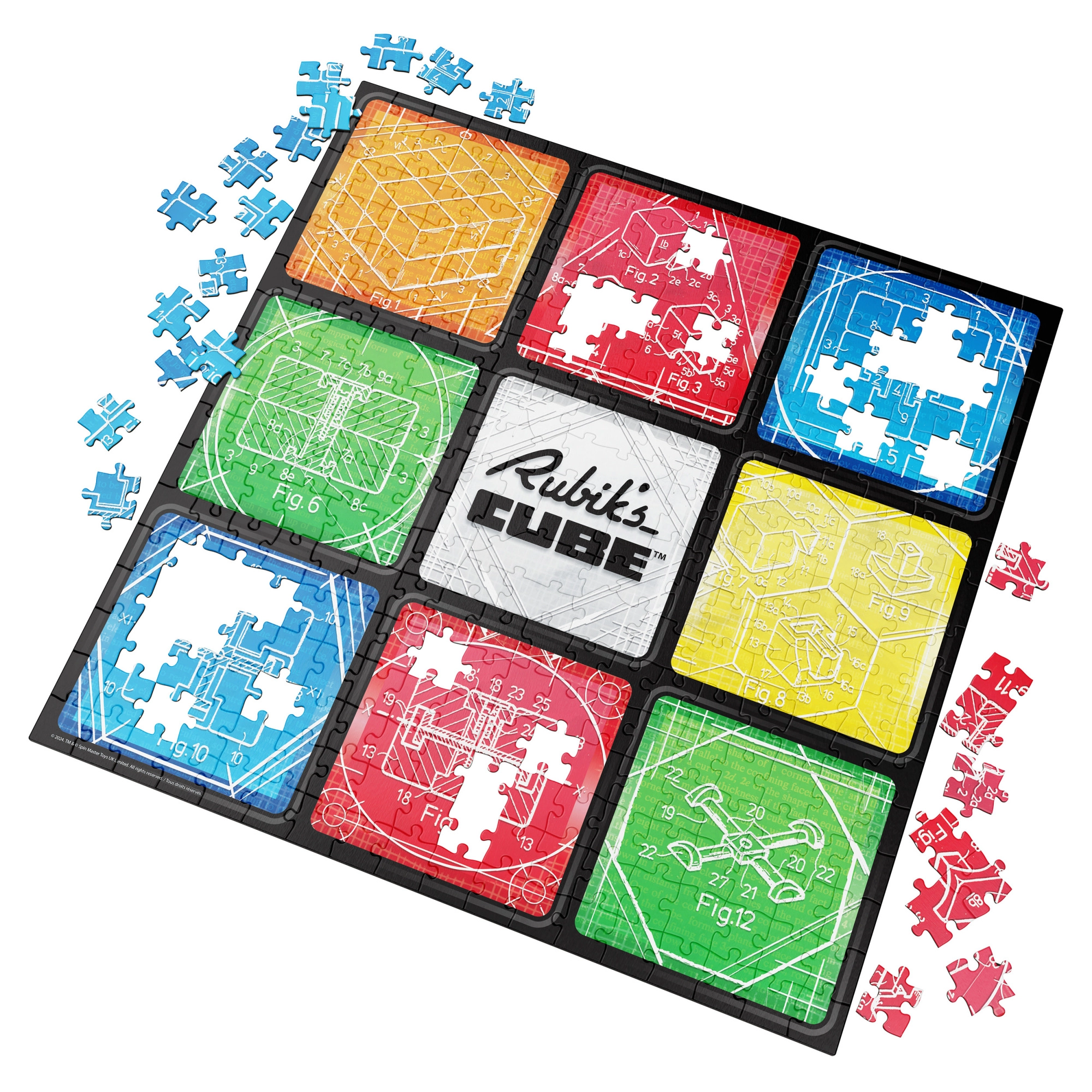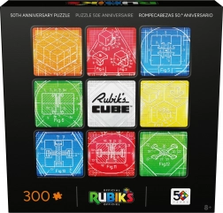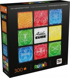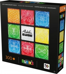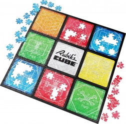 Tartalom és motívum: Összerakás után egy 50,8 × 50,8 cm-es négyzetes képet kapsz, kilenc mezővel, amelyek a klasszikus 3×3 elrendezésre utalnak. A kompozíció közepét a RUBIK’S CUBE logó díszíti, a környezetét pedig a híres kocka mechanikájának műszaki rajzai alkotják.