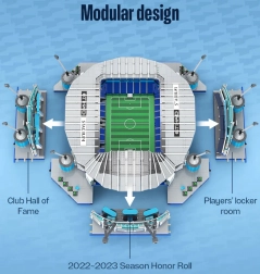 Építsd meg külön az öltözőt és a hall of fame-et. A nyomtatott elemek kihangsúlyozzák az ikonikus homlokzatokat és a belső részleteket.