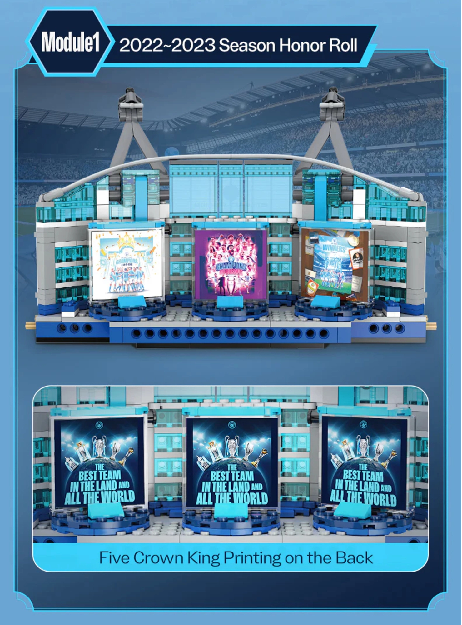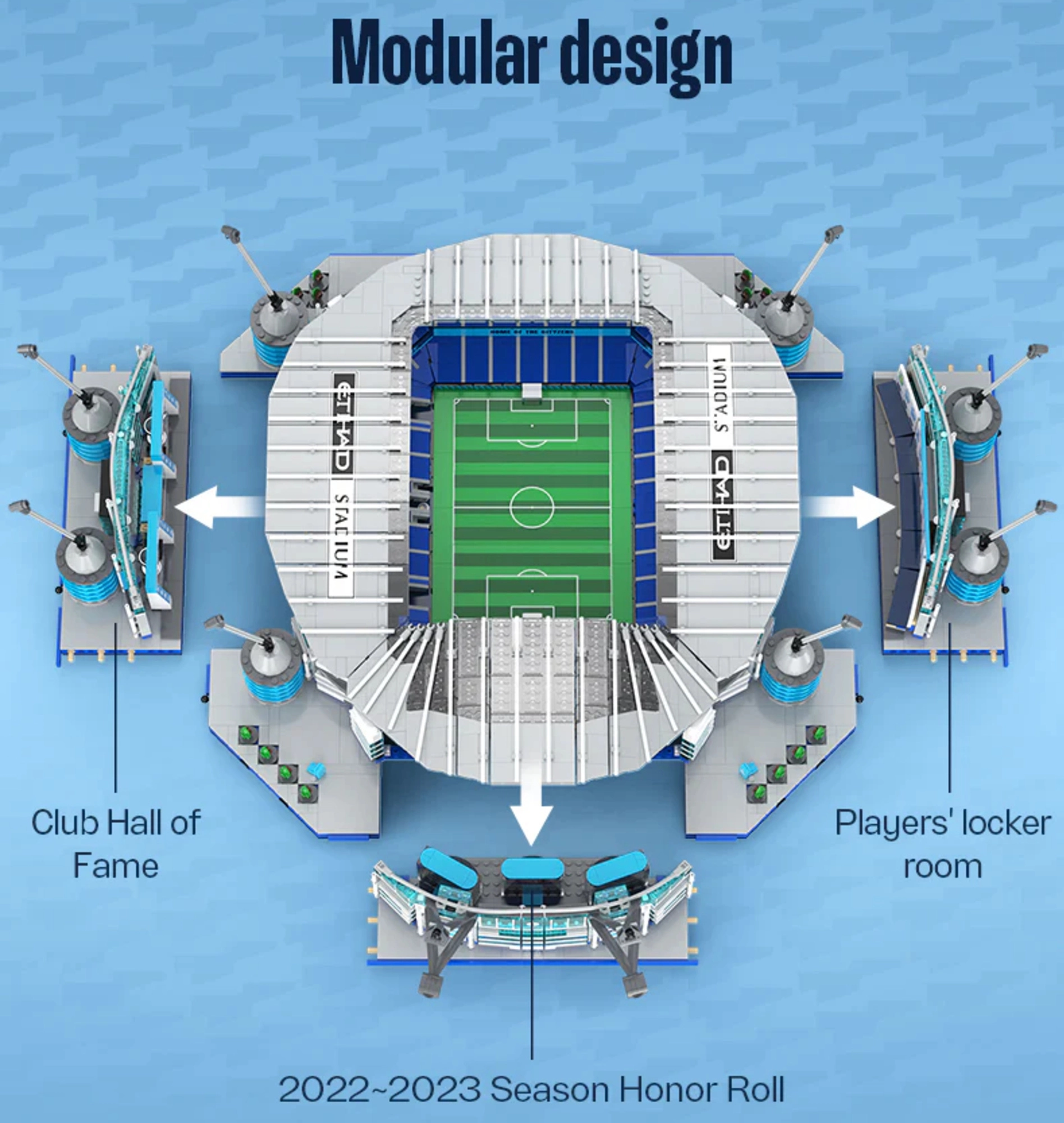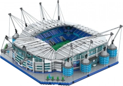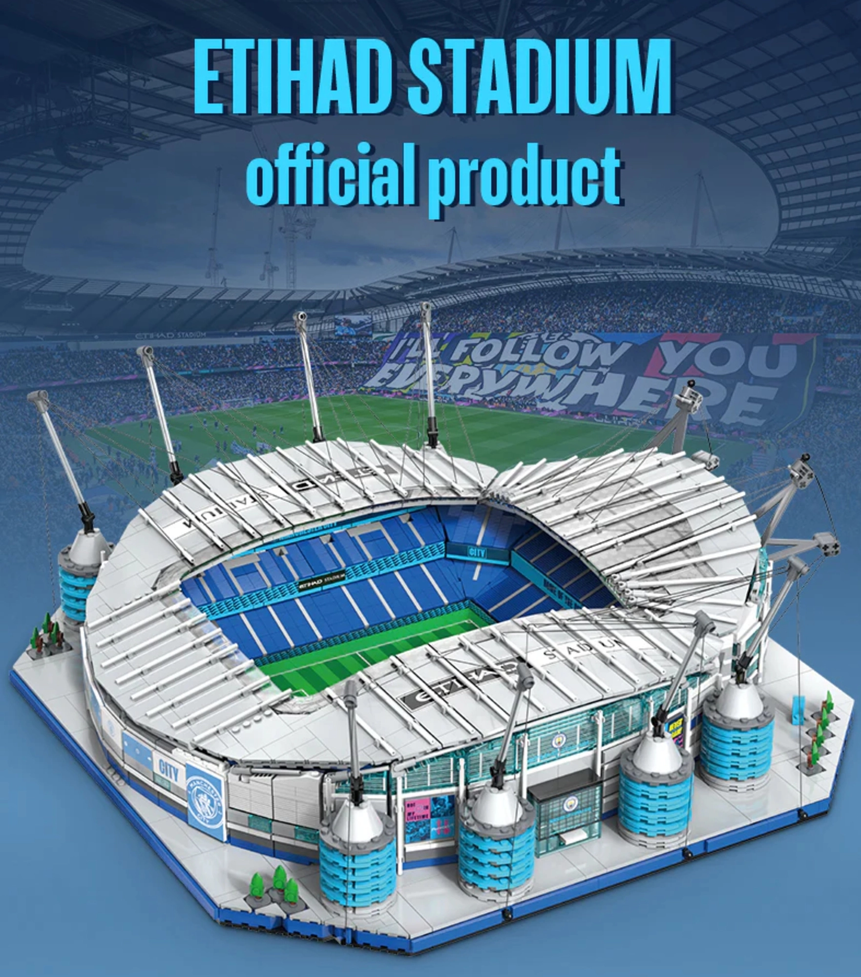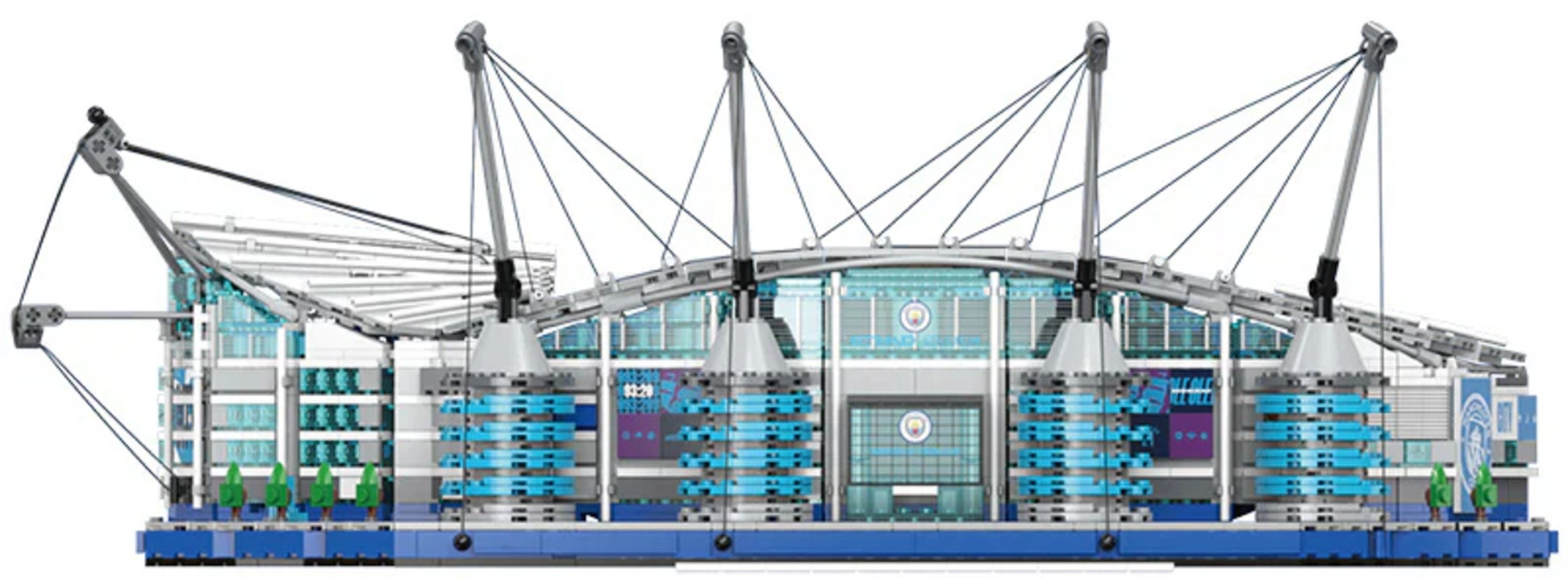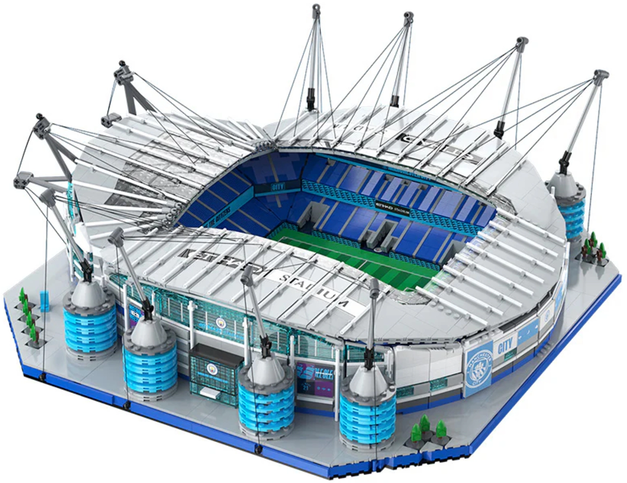 Garantált autentikusság az Etihad Stadion részleteiben – pontos arányok, lelátók, kapuk és a jellegzetes kábelrendszeres pilonok.