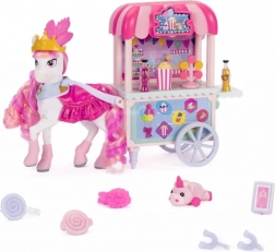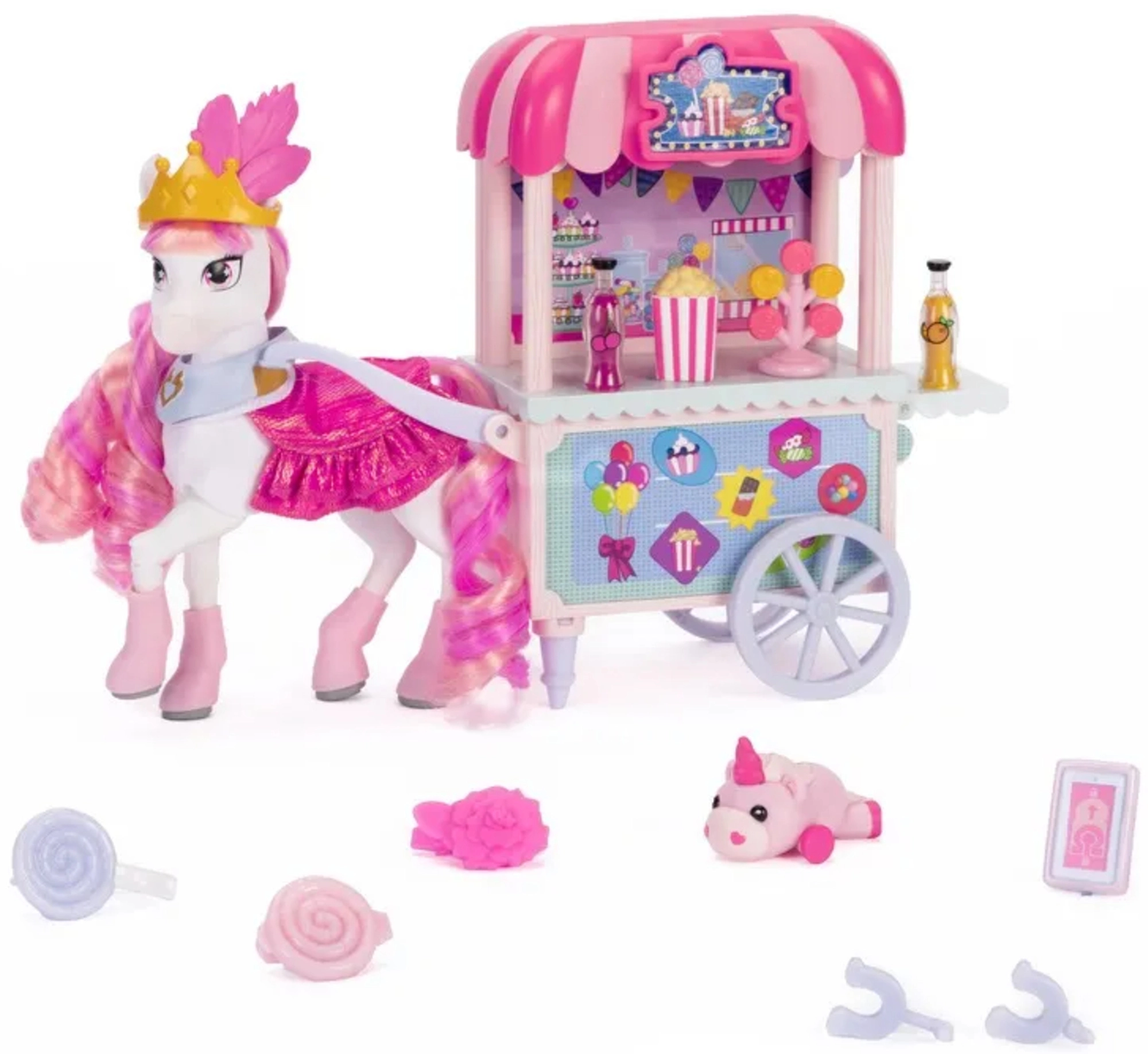 A színes Sugar Rush Carnival stand csíkozott tetővel és funkcionáló kerekekkel készen áll popcorn, nyalókák és italok árusítására. A rúd/vontató segítségével a kocsi Candihoz csatlakoztatható, és indulhat az édes út Mane Lane városkájában. A készlet tartalmaz ápolási és styling kiegészítőket is – kefe, csatok és egyebek.