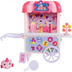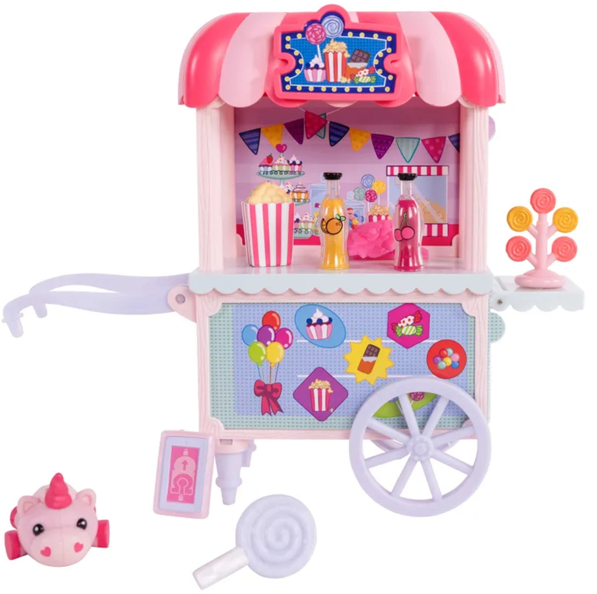 Színes kocsi csíkozott tetővel, tárolóhellyel és fogantyúval. Candihoz csatlakoztatható, és indulhat az édességárusítás.