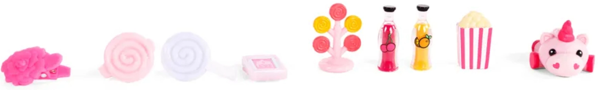 Popcorn, nyalókák, italok és további apróságok a valósághű játékért. Nem hiányzik a kefe és a csatok sem a sörény formázásához.
