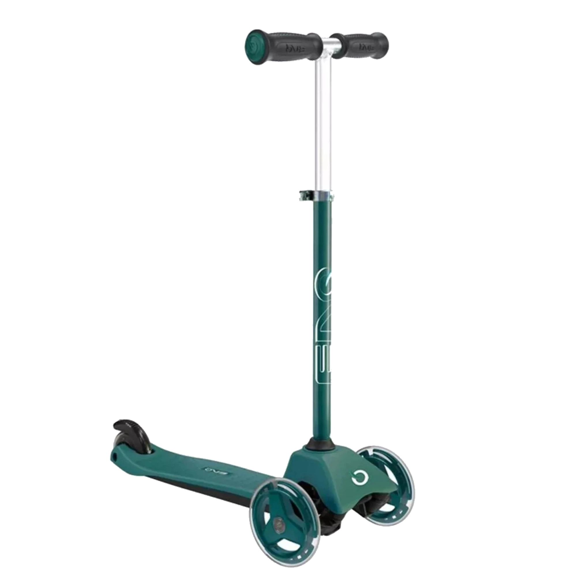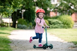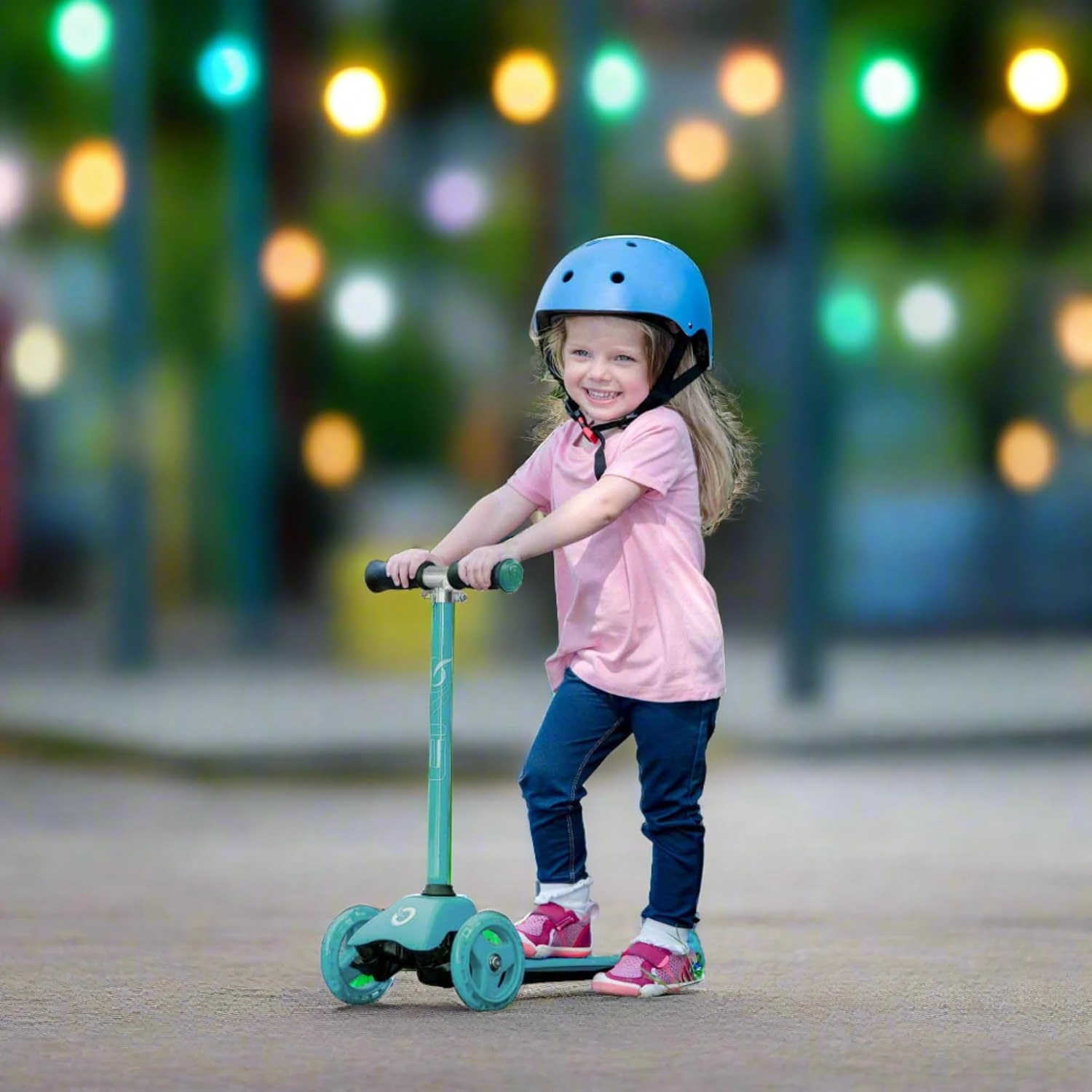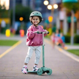 A stabilitást és biztonságot a két nagy első kerék és a kisebb hátsó kerék lábfékkel garantálja. A csendes, sima futást az ABEC-5 csapágyak segítik, a gumis TPE markolatok pedig csúszásmentes, biztos fogást adnak. A mindössze 2,75 kg-os tömeg megkönnyíti a hordozást és a mindennapi használatot.