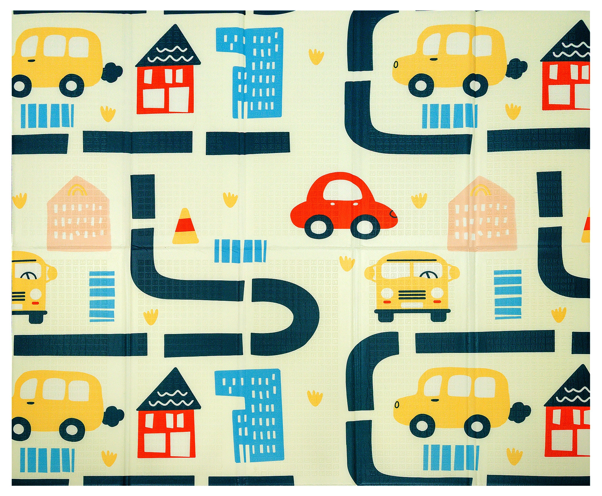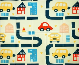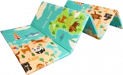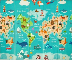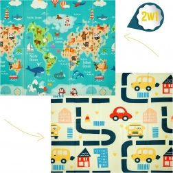 Az egyik oldalon színes világtérkép állatokkal, a másikon város és utak kisautókhoz. Két oktatási téma egy szőnyegben – fejleszti a fantáziát és a tudást.