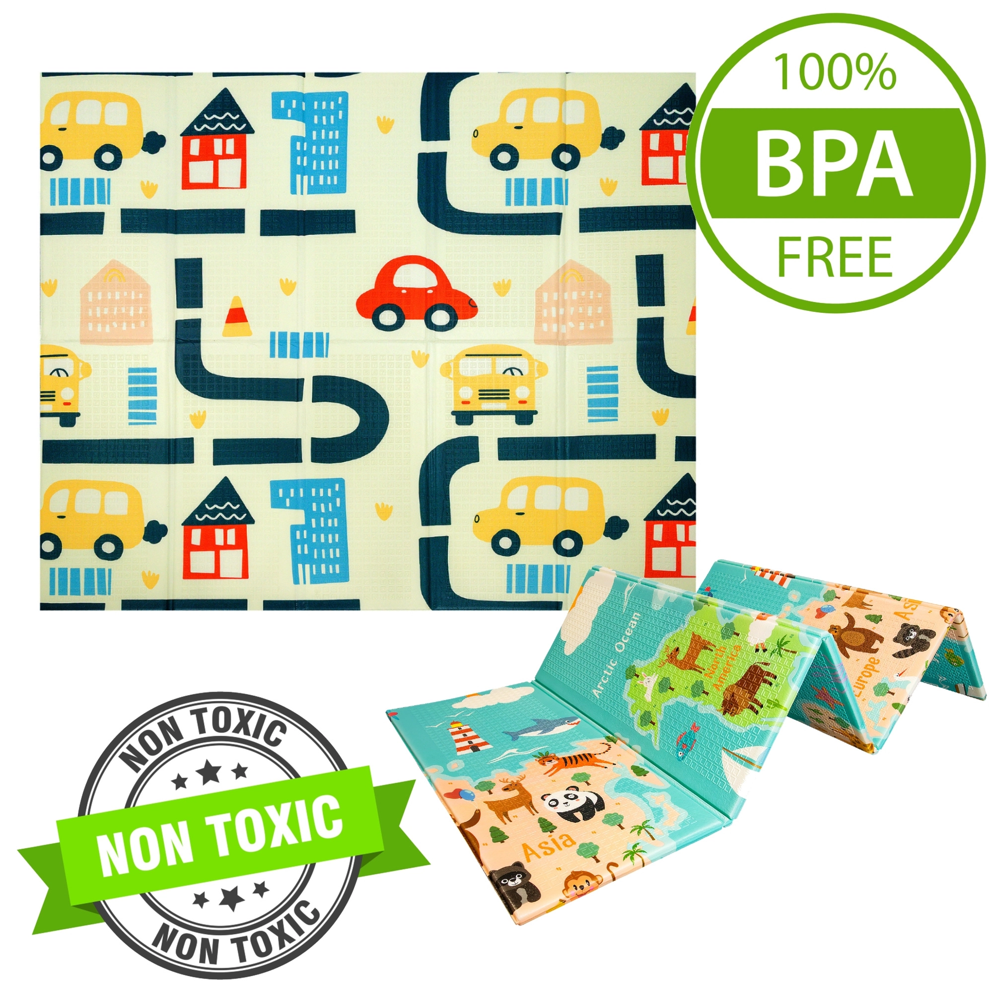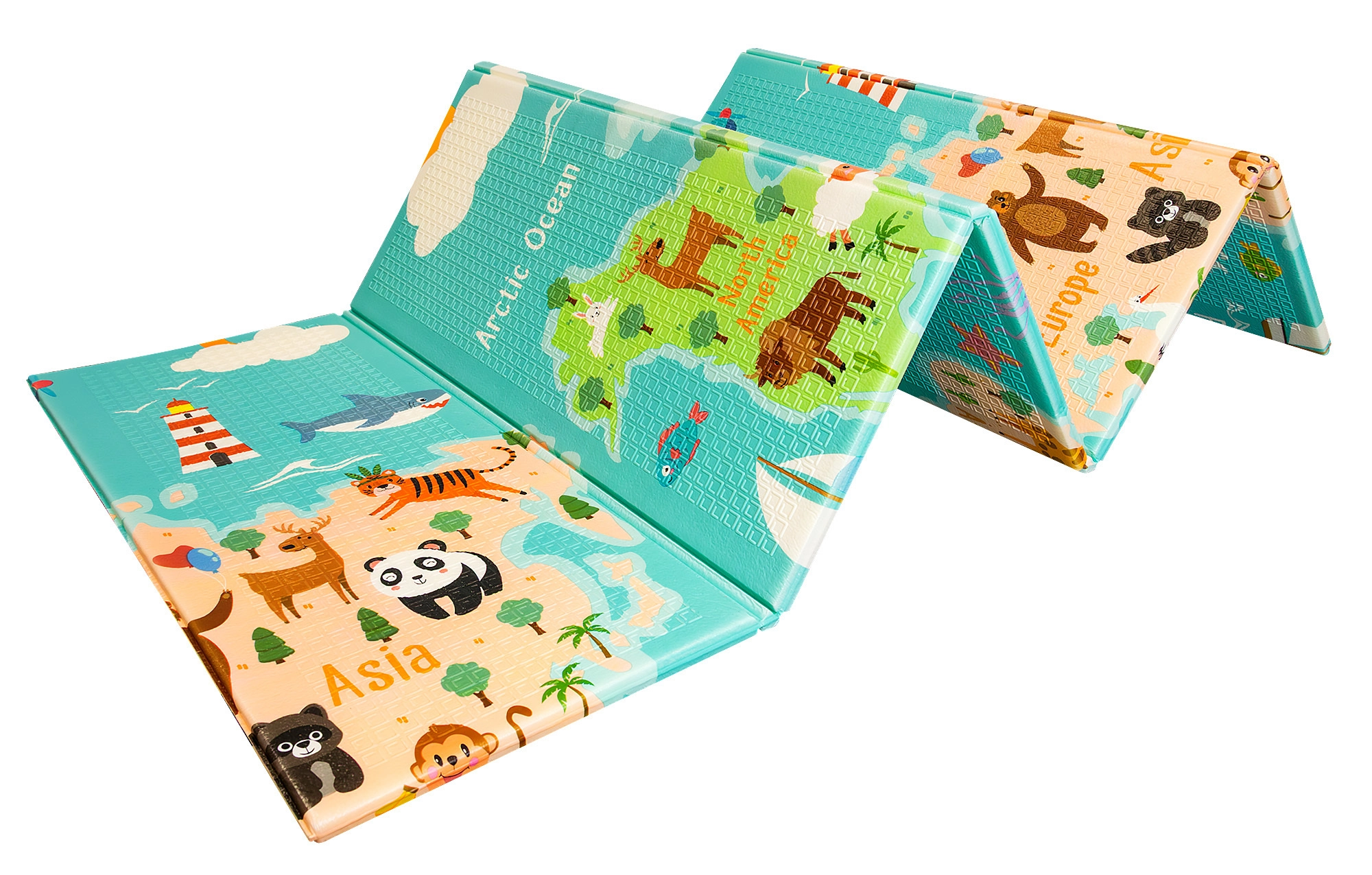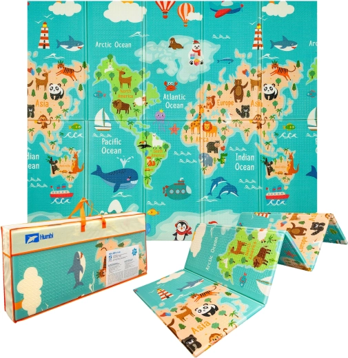 Fedezze fel a tágas és puha HUMBI játszószőnyeget prémium XPE habból, 200 × 180 × 1 cm méretben. Kétoldalas – az egyik oldalon színes világtérkép, a másikon városi utcák – és biztonságos, vízálló, könnyen tisztítható felületet kínál újszülött kortól. Összehajtható kialakításának és a csomagban található praktikus táskának köszönhetően tökéletes a gyerekszobába, nappaliba vagy a kertbe. Káros anyagoktól mentes, CE, EN71 és REACH tanúsítványokkal a szülők maximális nyugalmáért.