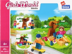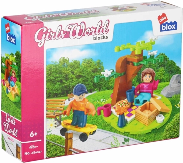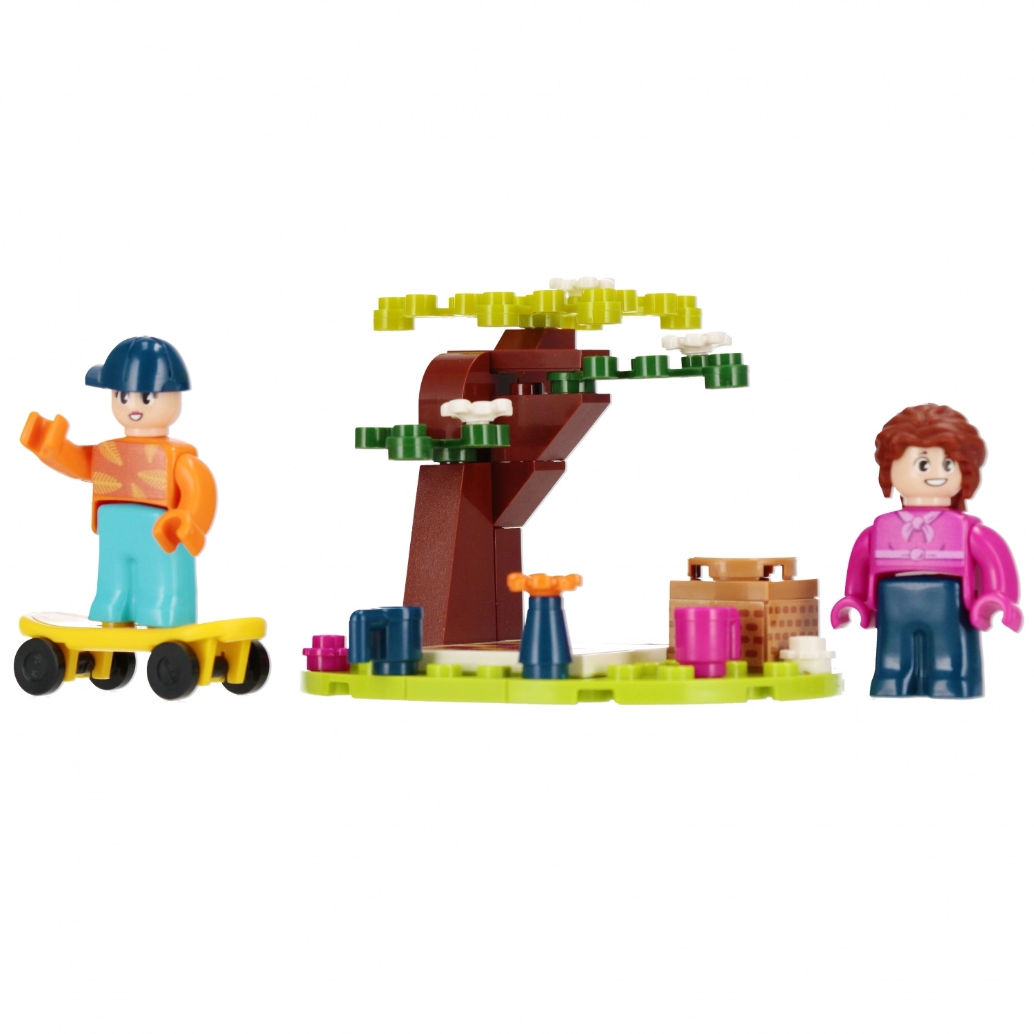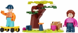A szettben két figura található, közülük az egyik sárga gördeszkán is gurulhat. Apró kiegészítők, mint bögrék, virágok és egy locsolókanna teszik még élethűbbé a piknik hangulatát. A kompakt méretű összeállított jelenet polcra és utazáshoz is ideális.