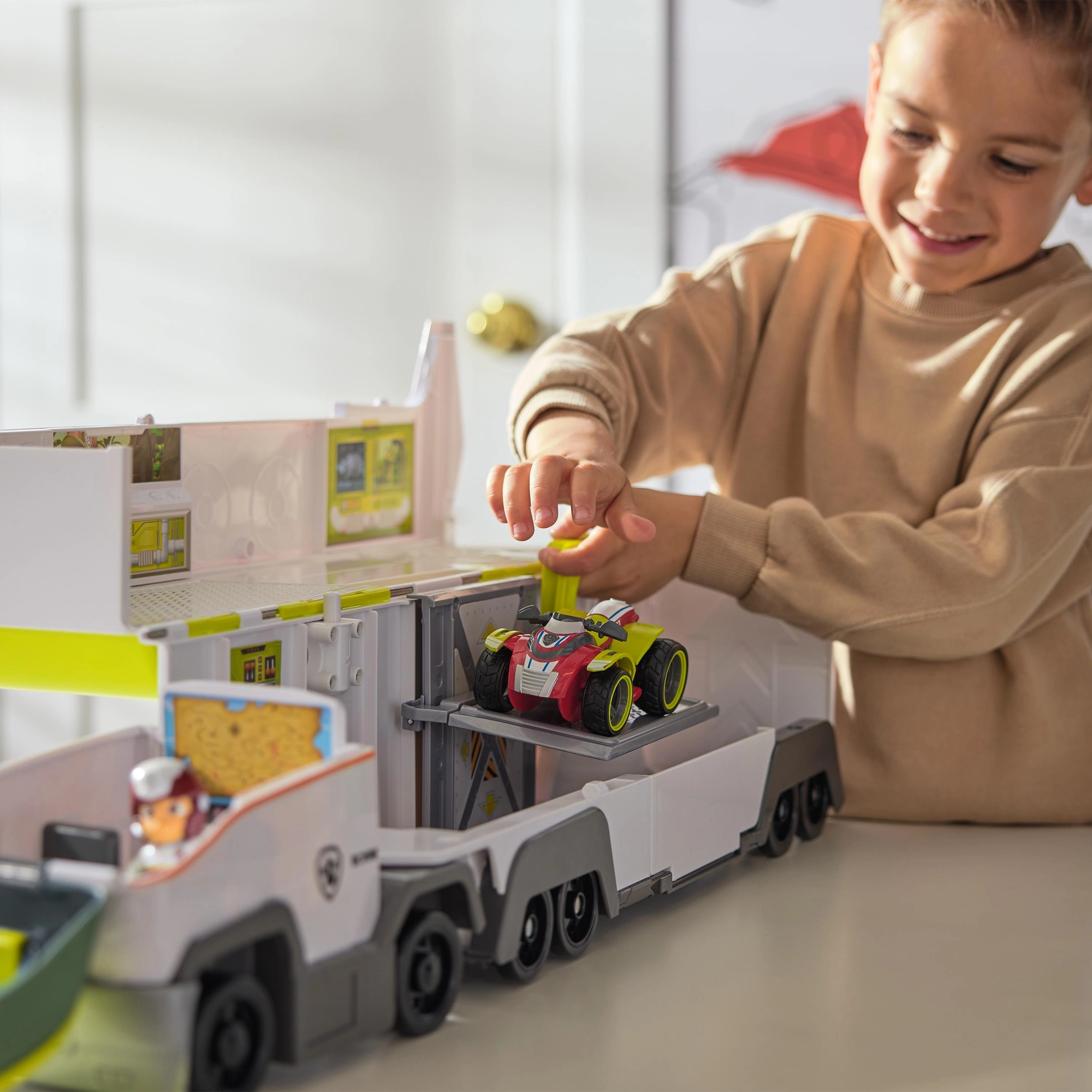 A szállító kinyitható, tágas játékszetté alakul panelekkel, rámpákkal és hellyel a figurák és járművek számára. Ideális a PAW Patrol csapat gyors bevetéséhez.