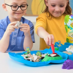Ez a kreatív, kinetikus homokkal készült szett valósághű élményt nyújt a gyerekeknek T‑Rex kövületek ásatásához. Az osztott tálcának köszönhetően minden kéznél van; a gyerekek keverhetik a homok színeit, formázhatják a tájat, és a dinoszaurusz csontvázat lenyomatként vagy formaként állíthatják össze. A homok kellemes tapintású, tartja a formát, miközben nem hagy rendetlenséget.