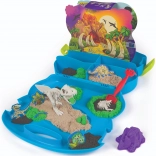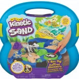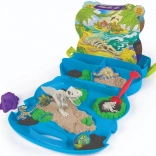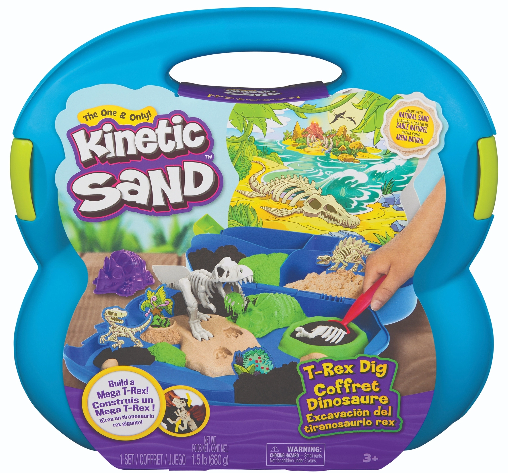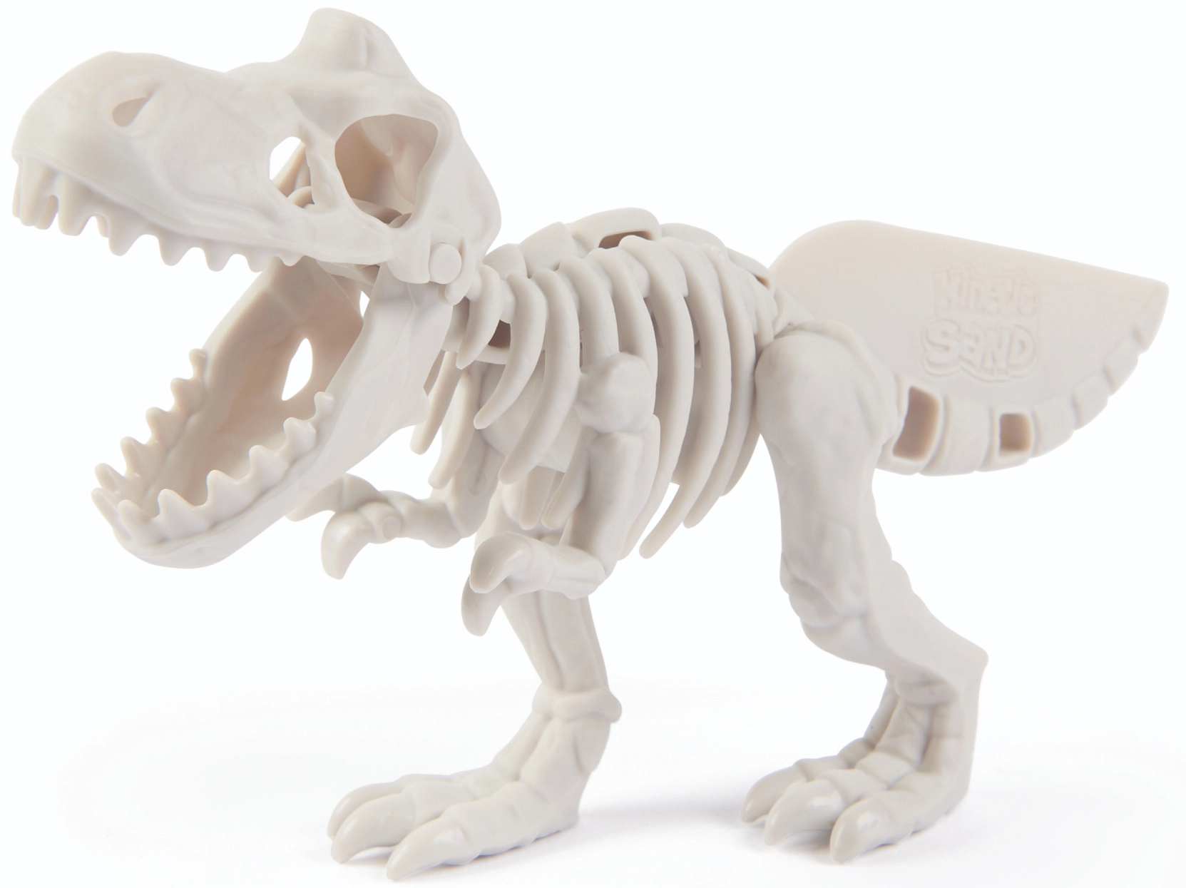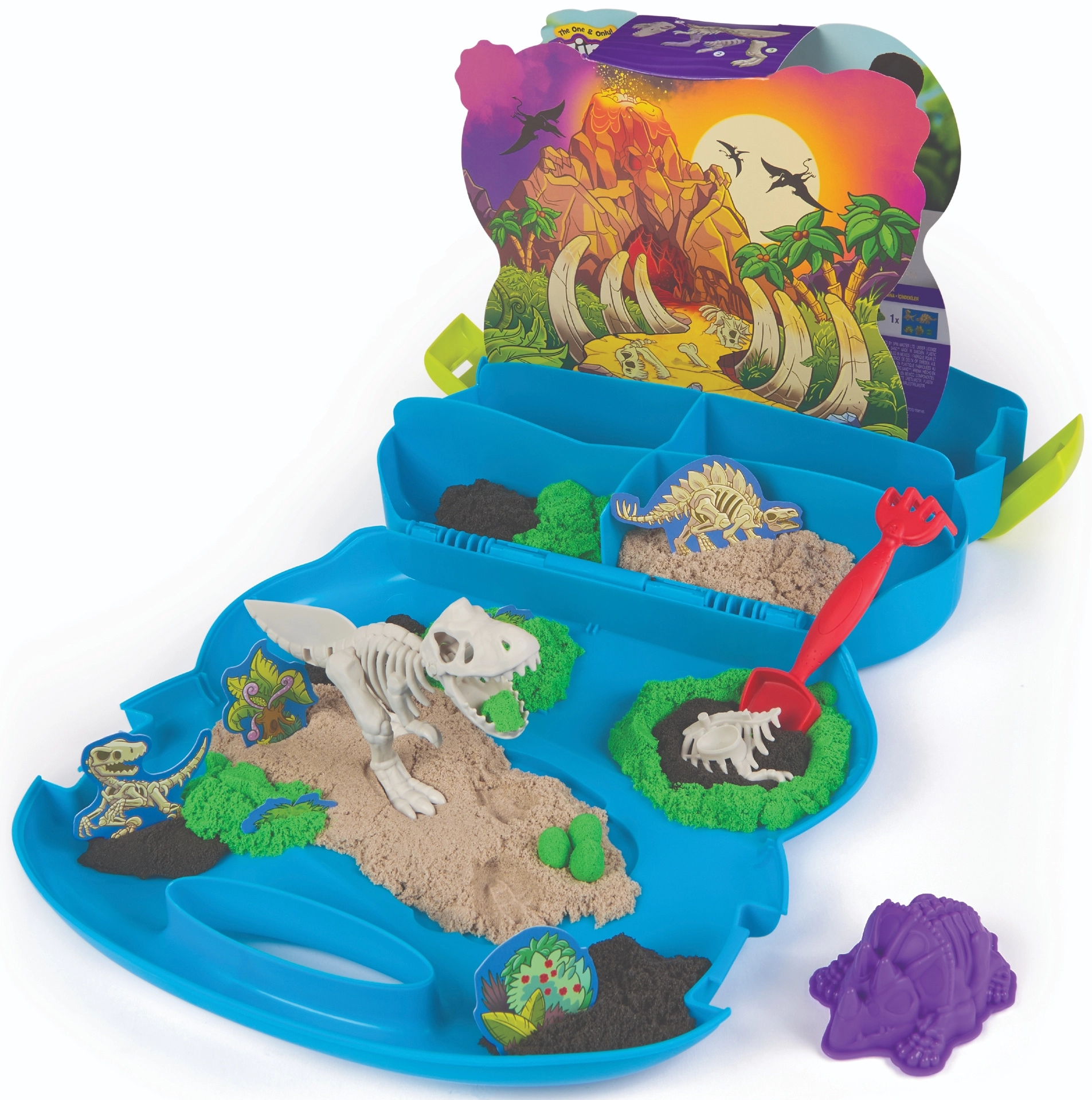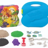 - Kinetikus homok, T‑Rex csontváz, formák és eszközök, karton figurák és háttér, hordozható tálca