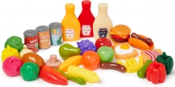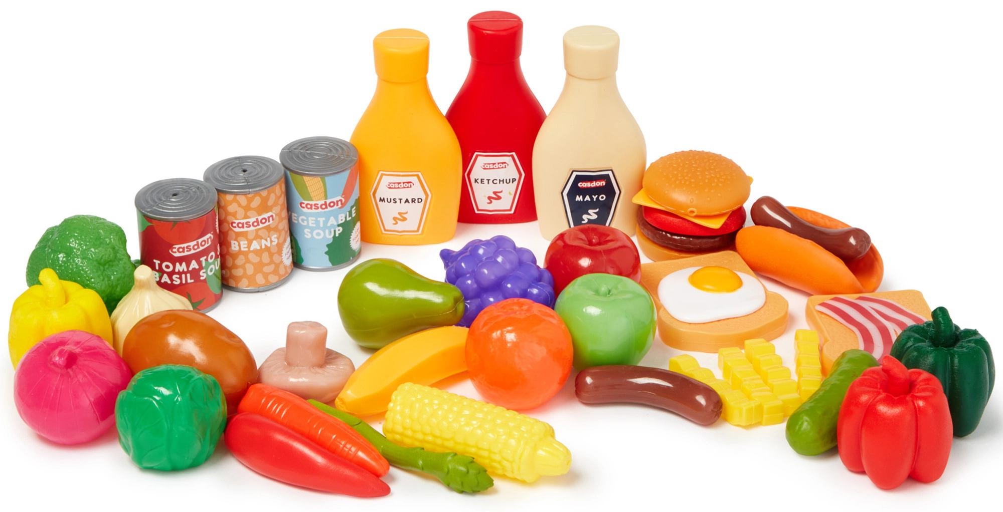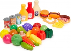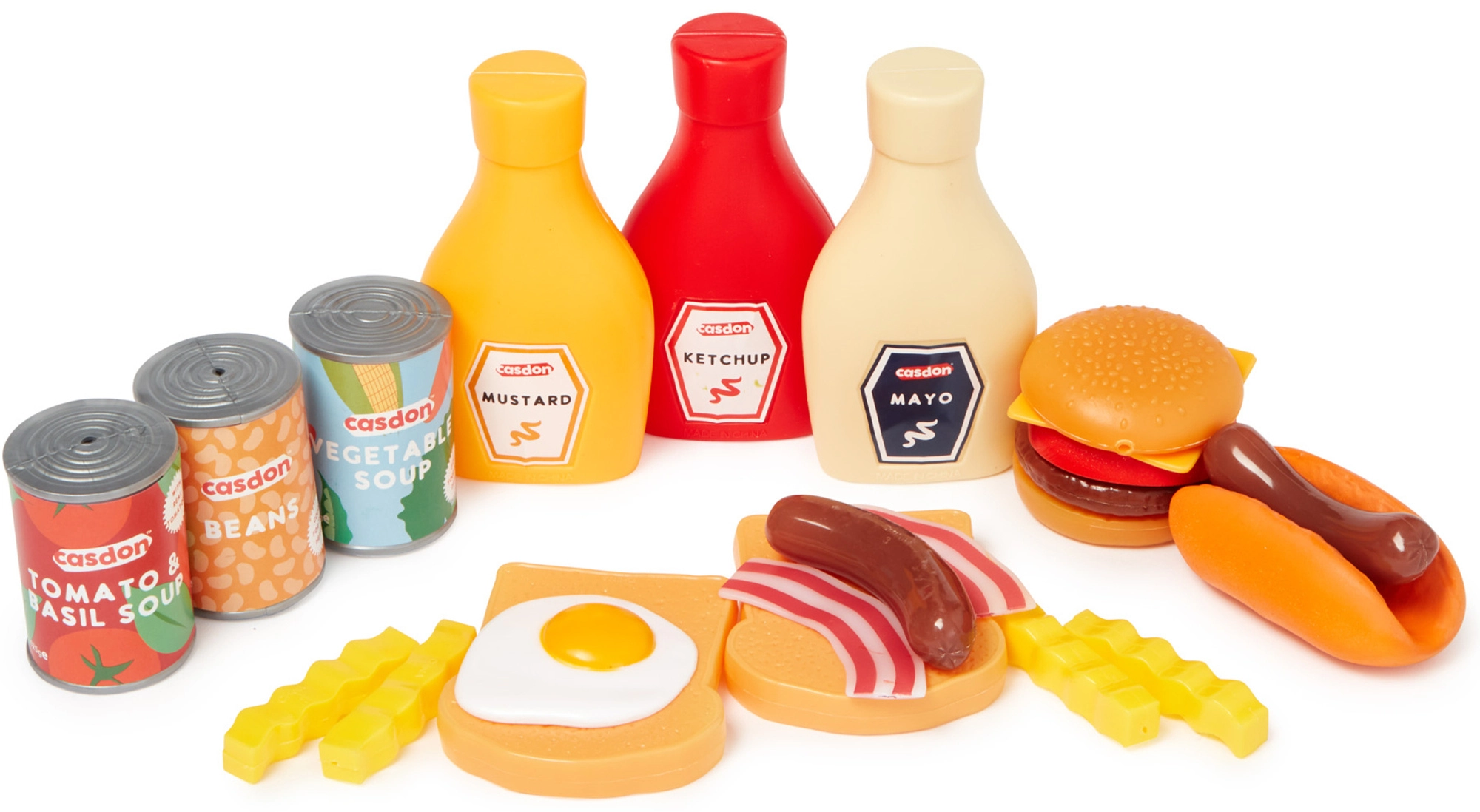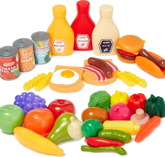 Ez a gazdag CASDON gyerek élelmiszerkészlet mindent kínál, amire a gyerekeknek szükségük van a valósághű főzős és vásárlós játékhoz. Találsz benne műanyag gyümölcsöket és zöldségeket (banán, alma, uborka, szőlő, hagyma, paprika, paradicsom, brokkoli), csomagolt termékek utánzatait (konzervek, ketchup, mustár, majonéz), valamint kedvelt finomságokat, mint a hamburger, hot dog, hasábburgonya vagy pirítós tükörtojással és szalonnával.