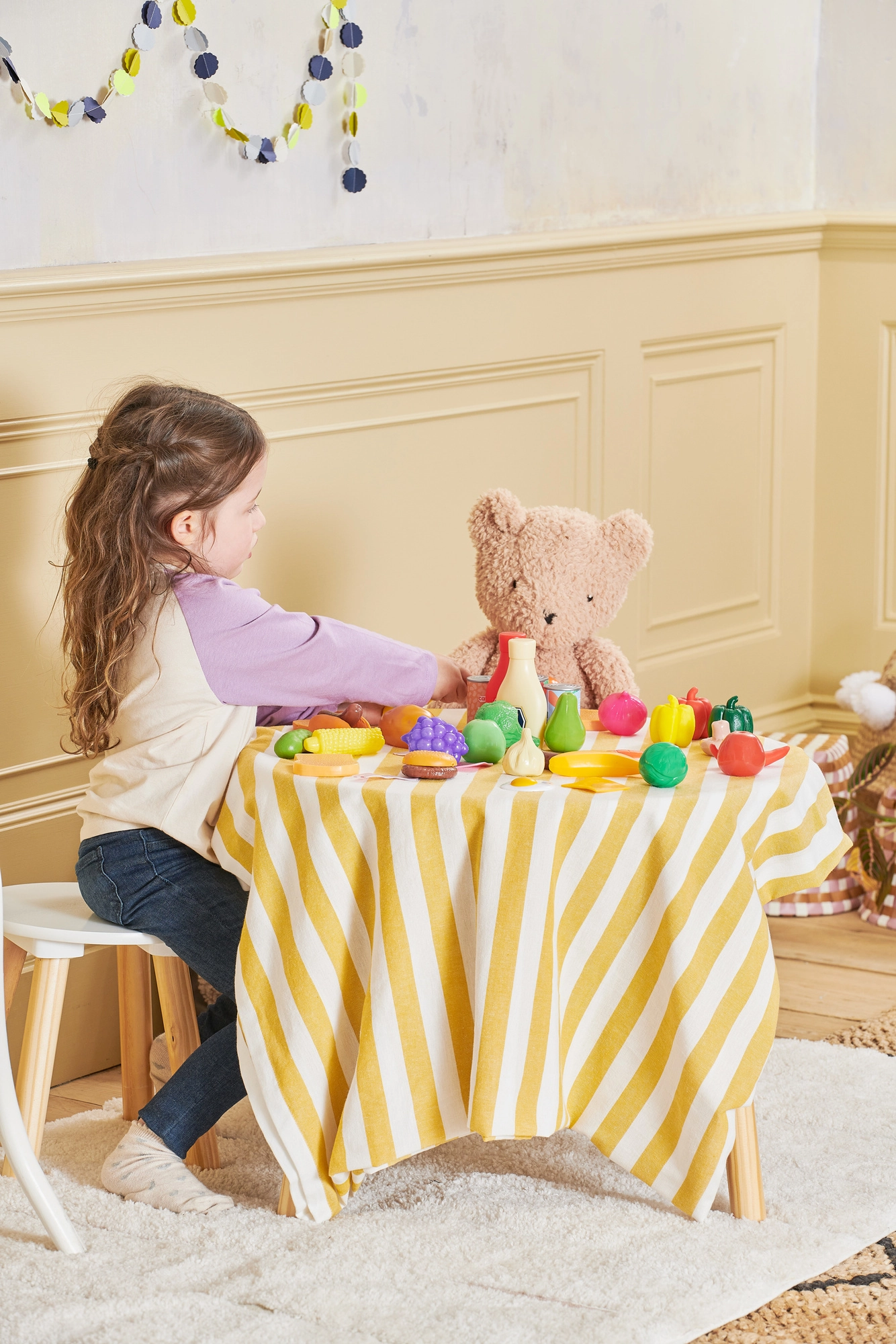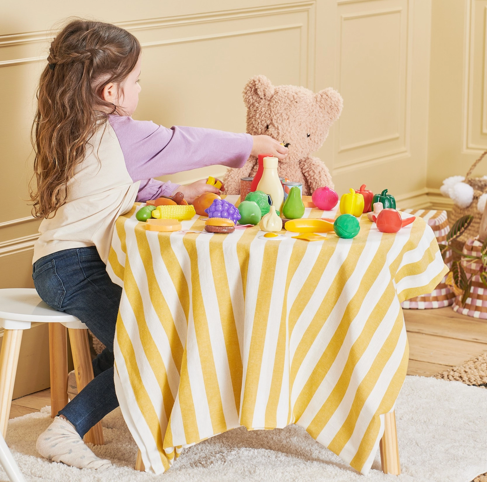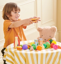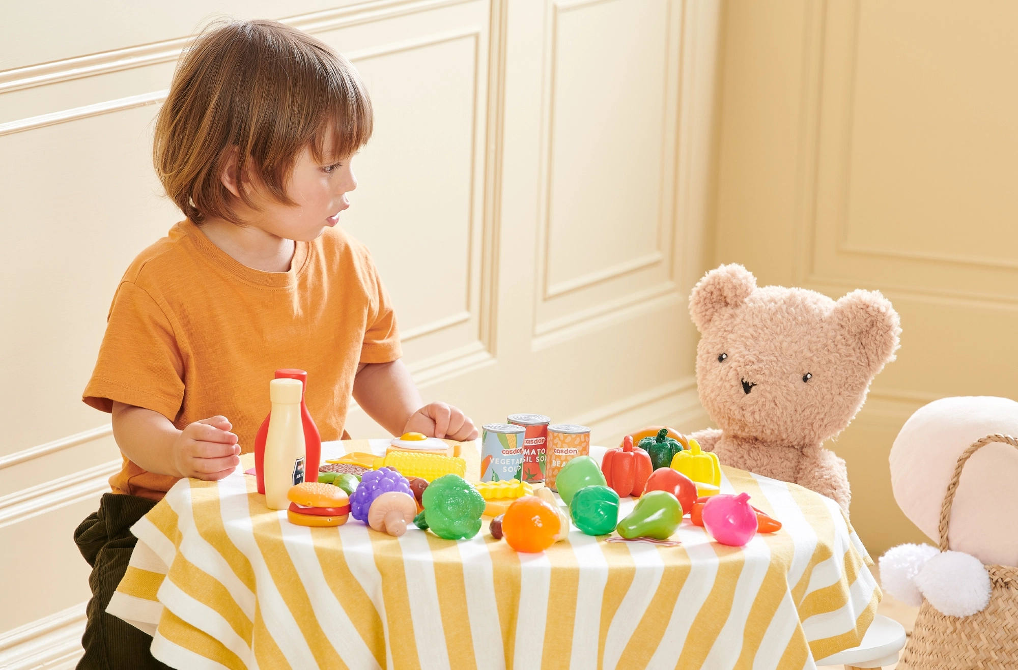 A friss gyümölcsöktől és zöldségektől a konzervekig és kedvenc finomságokig – a gyerekek könnyedén készíthetnek reggelit, ebédet és vacsorát, és gyakorolhatják a vásárlást és a tálalást.