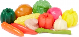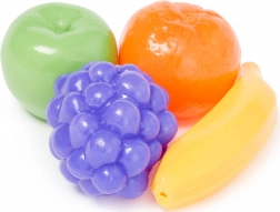 A műanyag gyümölcsök és zöldségek, kiegészítve miniatűr dobozokkal és konzervdobozokkal, úgy néznek ki, mint az igaziak. A gyerekek könnyen felismerik a banánt, a szőlőt, a kukoricát, a paprikát vagy a csiperkét, és megtanulják a hétköznapi élelmiszerek neveit.
