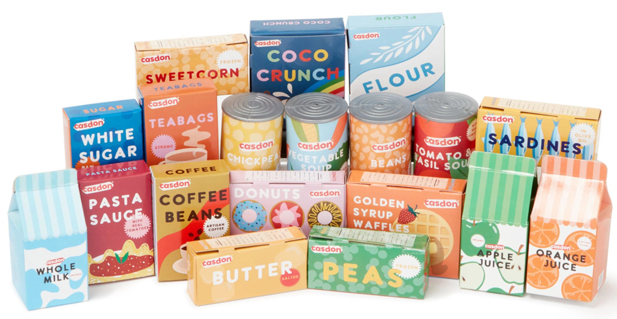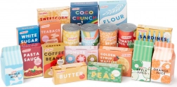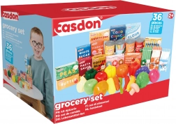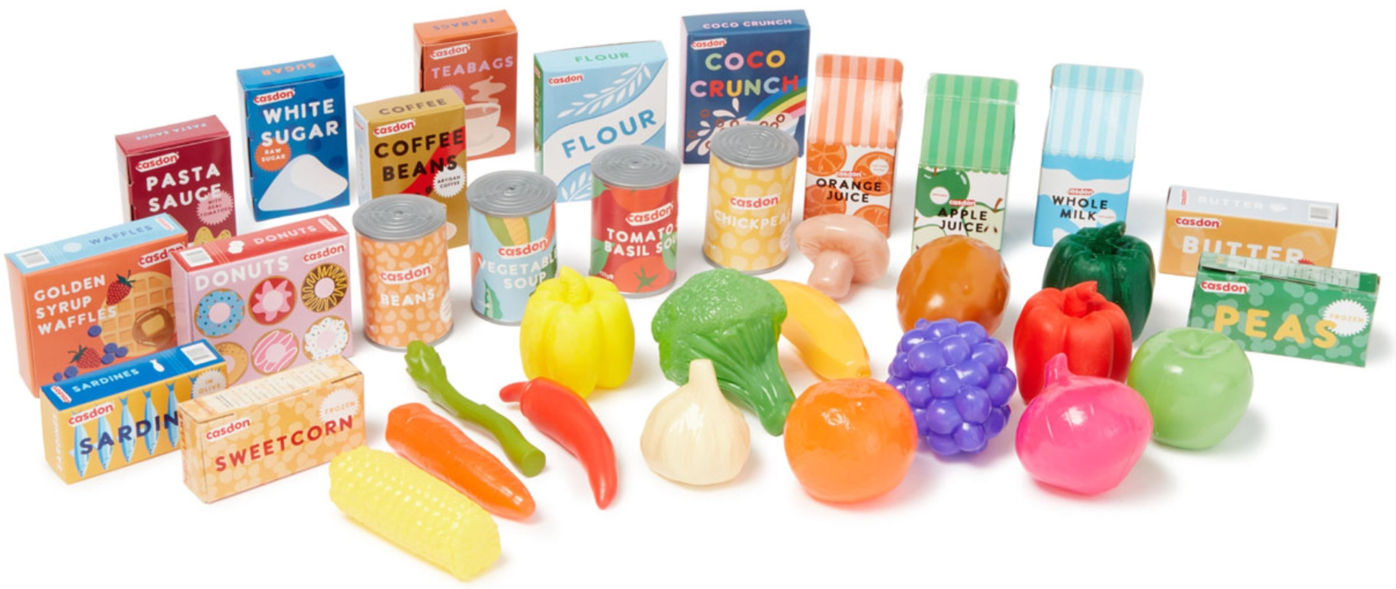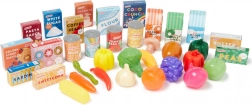 Ezzel a gazdagon felszerelt készlettel a gyerekek órákig élvezhetik a fantáziadús játékot. Találnak benne műanyag gyümölcsöket és zöldségeket (pl. banán, szőlő, kukorica, paprika, hagyma, fokhagyma vagy csiperke), valamint mini csomagolásokat hétköznapi élelmiszerekhez (liszt, cukor, kávé, tej, zöldborsó, bab, szardínia), továbbá italokat és leveseket. Az élethű formák, színek és nyomatok játékos tanulást tesznek lehetővé.
