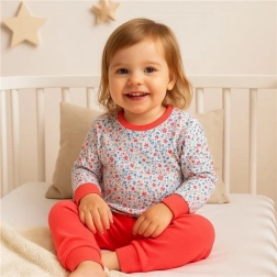 A New Baby Flowers pamut gyermek pizsama egész éjszakán át tartó kényelmet nyújt. A gomb nélküli, puha felső könnyen felvehető a fej fölött, a nem szorító nyakszegély pedig kellemes viseletet garantál. A nadrág rugalmas, gumis derékkal készül, amely nem vág be, a szárakon lévő bordás szegélyek pedig jobban tartják a meleget.