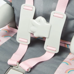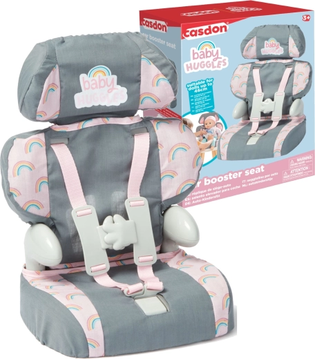 A szürke–rózsaszín kivitel szivárvány mintával nemcsak bájos, hanem praktikus is – az anyagok tartósak és kellemes tapintásúak. Az autósülés 46 cm-ig alkalmas babákhoz, és remek választás otthoni játékhoz, utazáshoz vagy a babák „etetéséhez”.