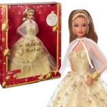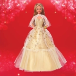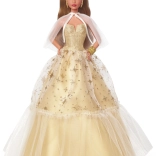 Elegáns BARBIE gyűjtői baba a 35. évforduló alkalmából, pezsgőszínű szaténruhában és arany csillagokkal díszített tüllszoknyában. A megjelenést ráncolt, áttetsző pelerin, arany ékszerek, valamint igényes smink- és manikűrrészletek egészítik ki. Ideális karácsonyi ajándék és bármely kollekció éke.