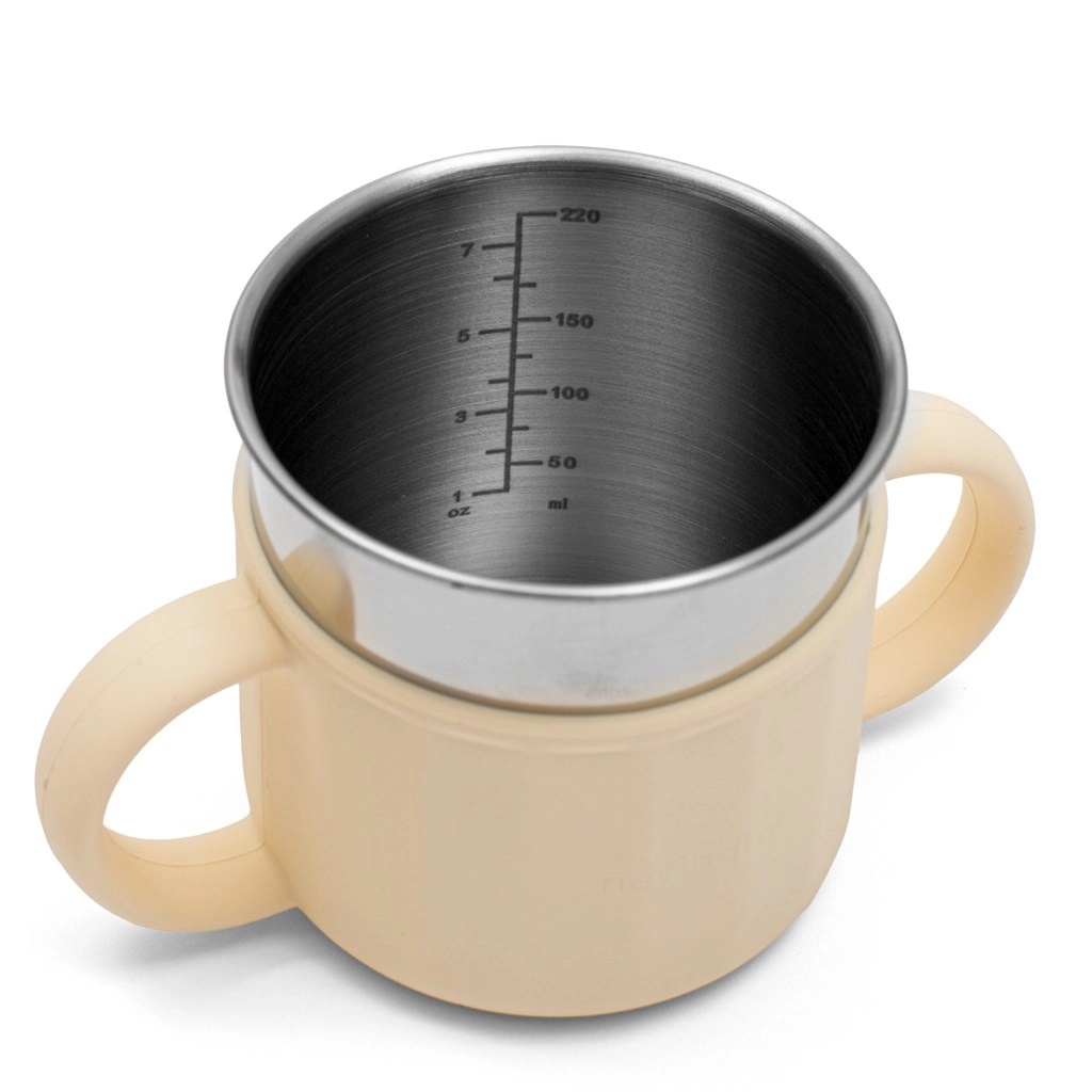 Fedezze fel a stílusos és funkcionális NEW BABY 2 az 1-ben bögrét, amely együtt nő gyermekével. Az 50% puha szilikon és 50% rozsdamentes acél kombinációja tartósságot, higiéniát és könnyű tisztítást biztosít. A két oldalsó fülnek köszönhetően a bögre még a legkisebbeknek is kényelmesen tartható, a visszafogott, bézs dizájn pedig bármelyik enteriőrbe illik.