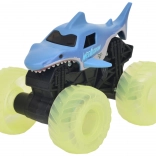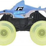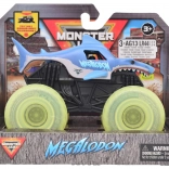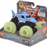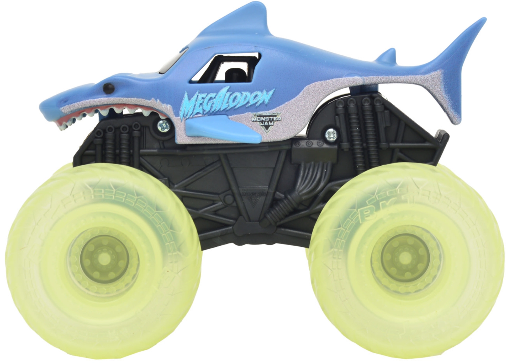 A népszerű, őskori cápáról ihletett Megalodon élethű karosszéria-részletekkel hódít kékesszürke tónusokban, uszonyokkal és fogakkal, amelyek kiemelik a vad megjelenést. A nagy, áttetsző kerekek és a robusztus alváz ideálisak a kaszkadőrmutatványokhoz otthon és útközben.
