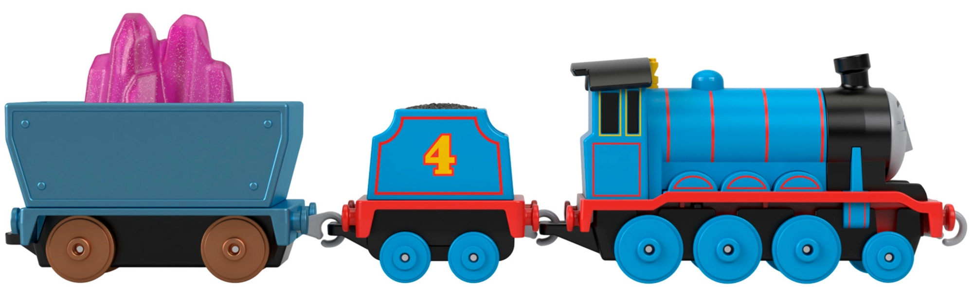 A készlet tartalmaz egy kék mozdonyt tendervagonnal, egy nyitott kocsit és kristályrakományt a nyersanyagok élethű szállításához a pályán.