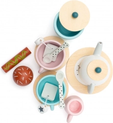 Stílusos, pasztellszínű gyerek teaszett, ideális az első társas játékokhoz. Tartalma: kancsó, cukortartó, csészék aljakkal, kanalak, teafilterek és fa finomságok – mind ellenálló fából, precíz kidolgozással. A készlet támogatja a szerepjátékot, az étkezési szabályok elsajátítását és a kéz–szem koordináció edzését.