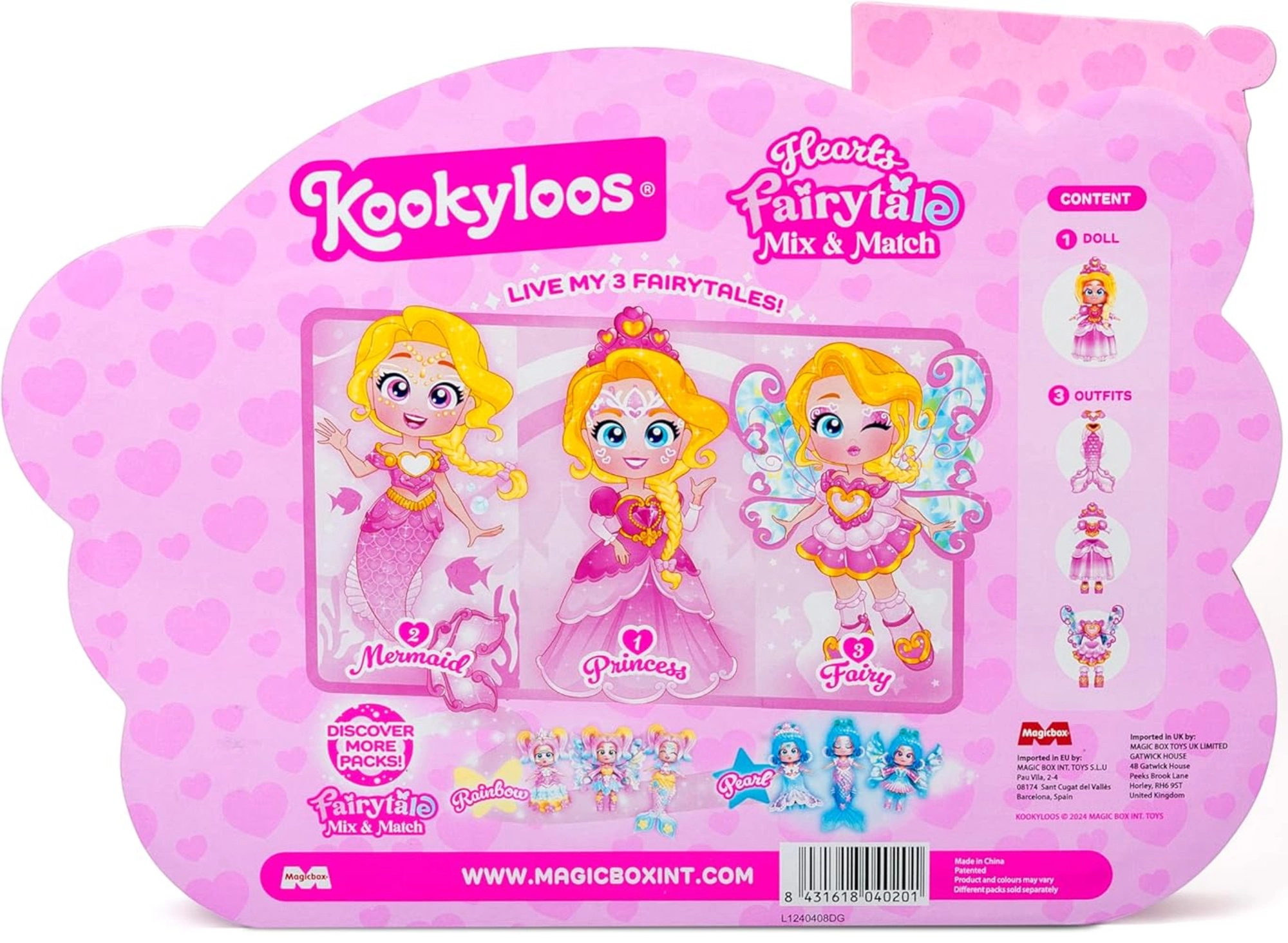 A KookyLoos Fairytale Hearts a fantáziát hozza el a gyerekeknek: egy szempillantás alatt az elegáns hercegnőből elbűvölő tündér vagy fürge sellő lesz. A figurának mozgatható karjai vannak, és egy speciális kattintó mechanizmus, amely 3 arckifejezést vált – mosolyt, álmodozó tekintetet és meglepetést.